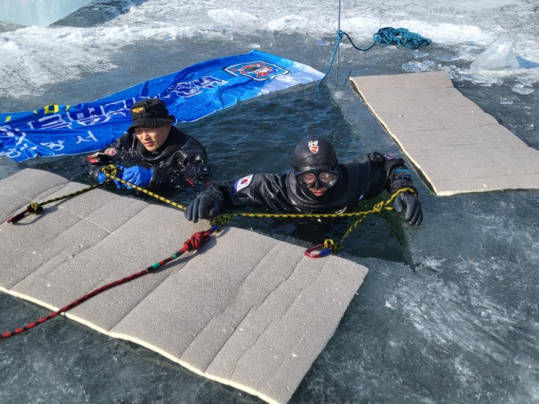 주요 내용은 ▲각종 빙상구조 장비를 이용한 인명구조 훈련 ▲동계 잠수개론 및 얼음 밑 수중탐색 ▲얼음물 적응 및 비상시 대처방법 ▲유관기관과의 구조기법 교류 등을 통한 수난구조역량 강화 등이다.