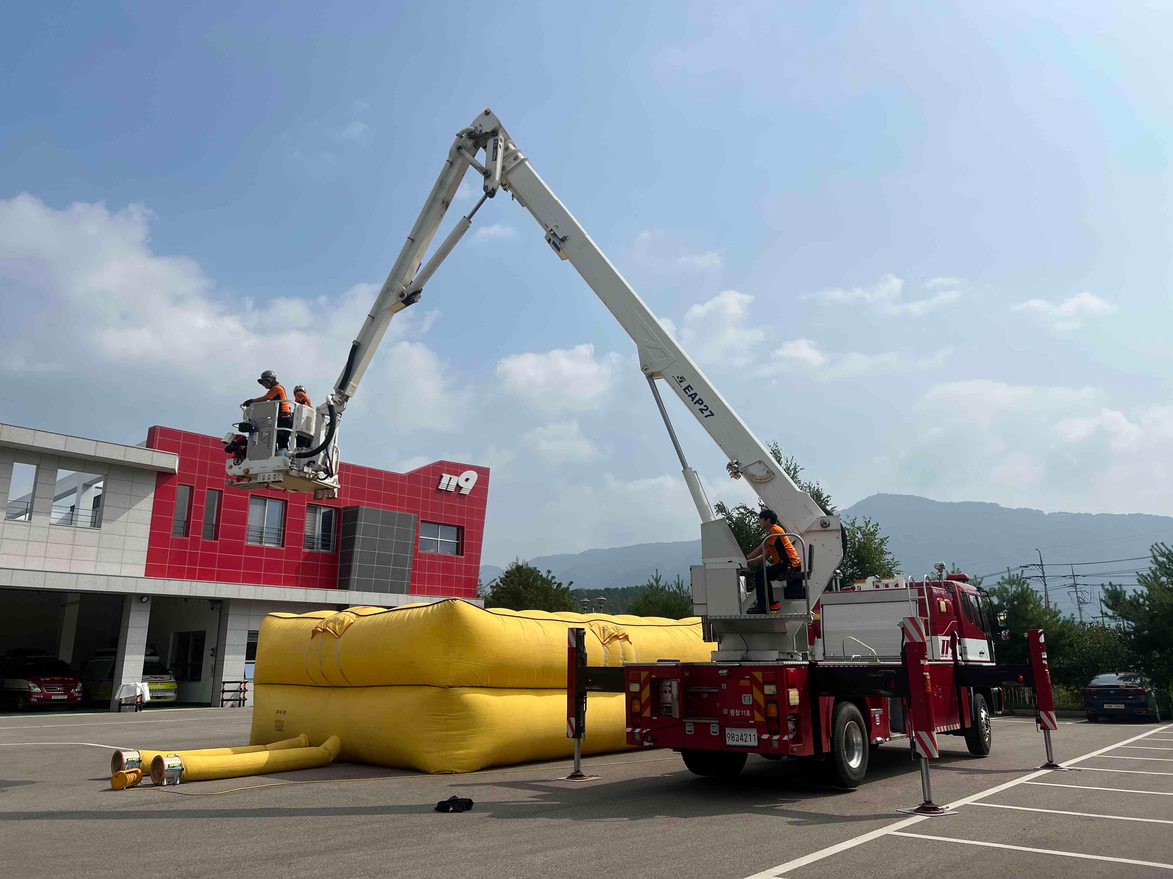 주요 훈련 내용은 ▲에어매트 전개 및 설치 훈련 ▲20m 이하 높이에서 마네킹을 활용한 탈출 훈련 ▲에어매트 사용 매뉴얼 숙지 ▲ 안전사고 방지 교육 등이다.
