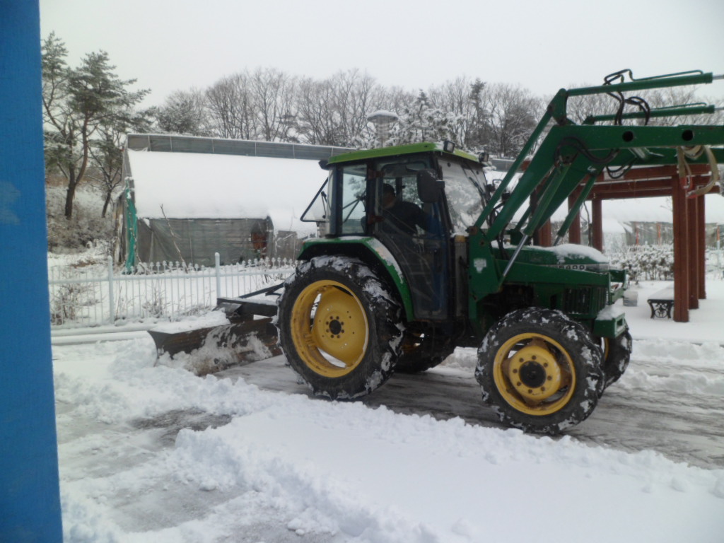 제설작업간 대관령 의용소방대 함길수대원의 트랙터협조로 인하여 수월한 작업이 되어 직원들은 감사해하고있다