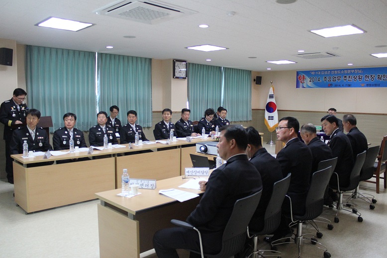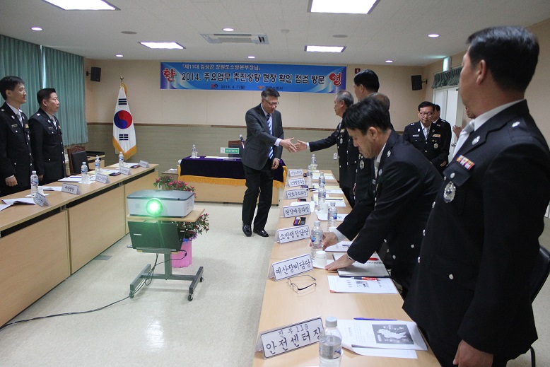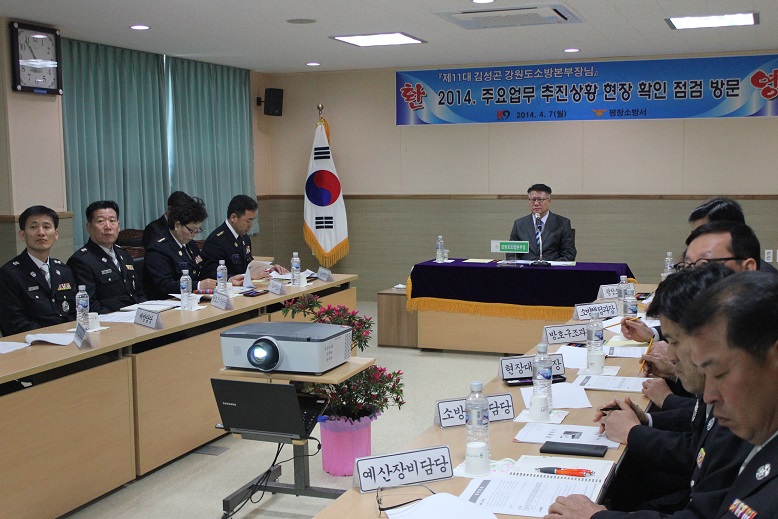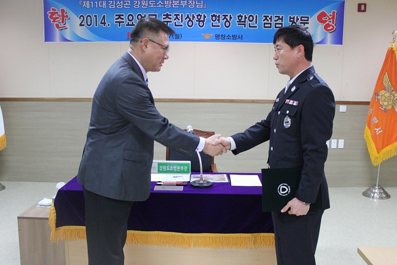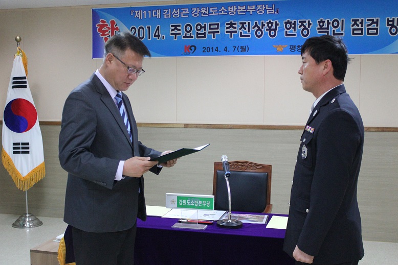이날 김성곤 본부장은 2013 국민행복 안전정책 유공자인 평창소방서 소방위 박유삼에 대한 소방방재청장표창장을 수여하고 김남숙 평창소방서장으로부터 2014년 주요현안업무 추진사항을 보고받았다.