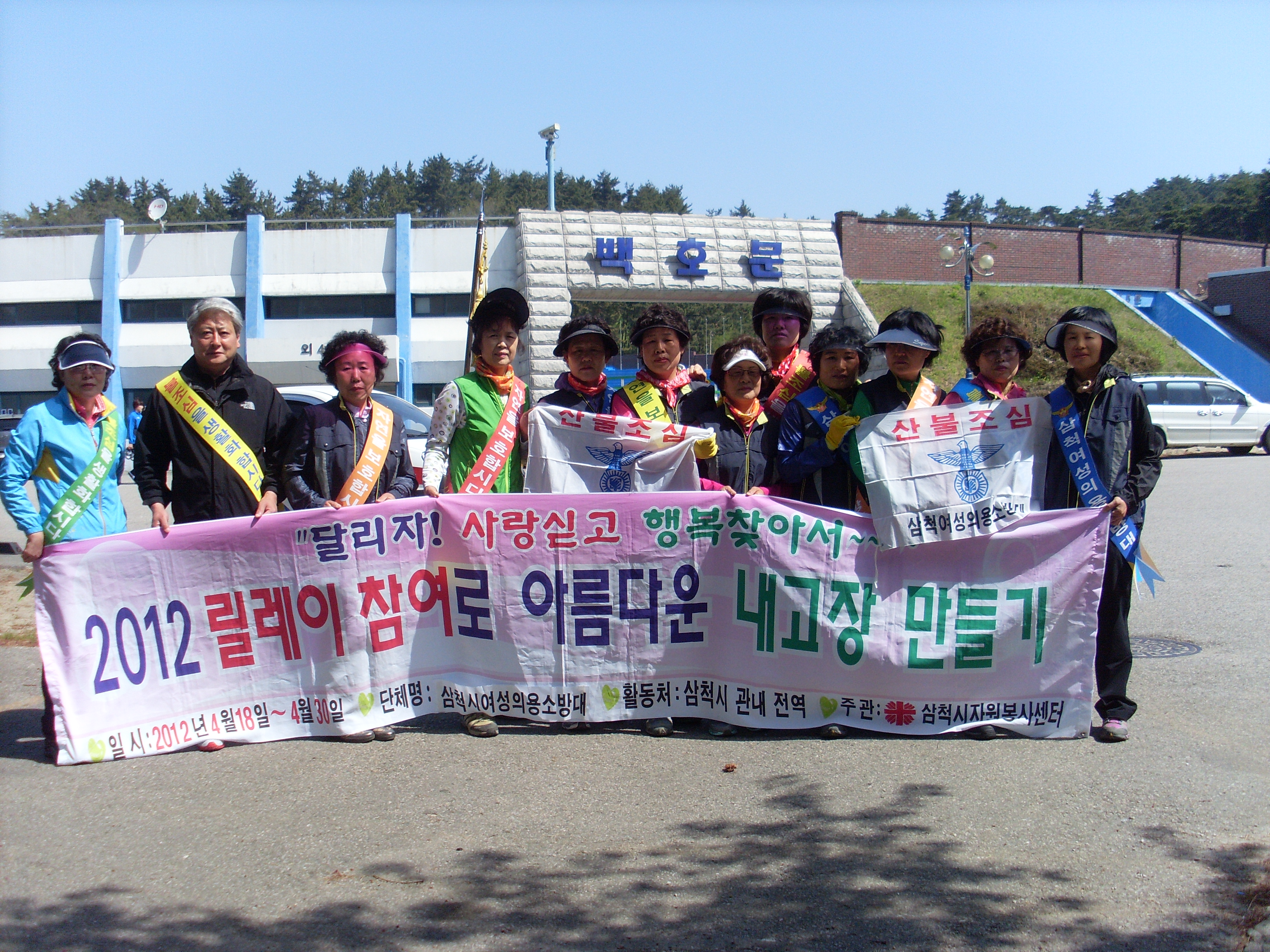 2012년4월30일 4월 마지막날 공설운동장 집결 봉수대 경유하여 봉황산까지 불조심 홍보 및 자연정화활동 (대장 최금순), 대원 모두 더위에 애쓰셧습니다.