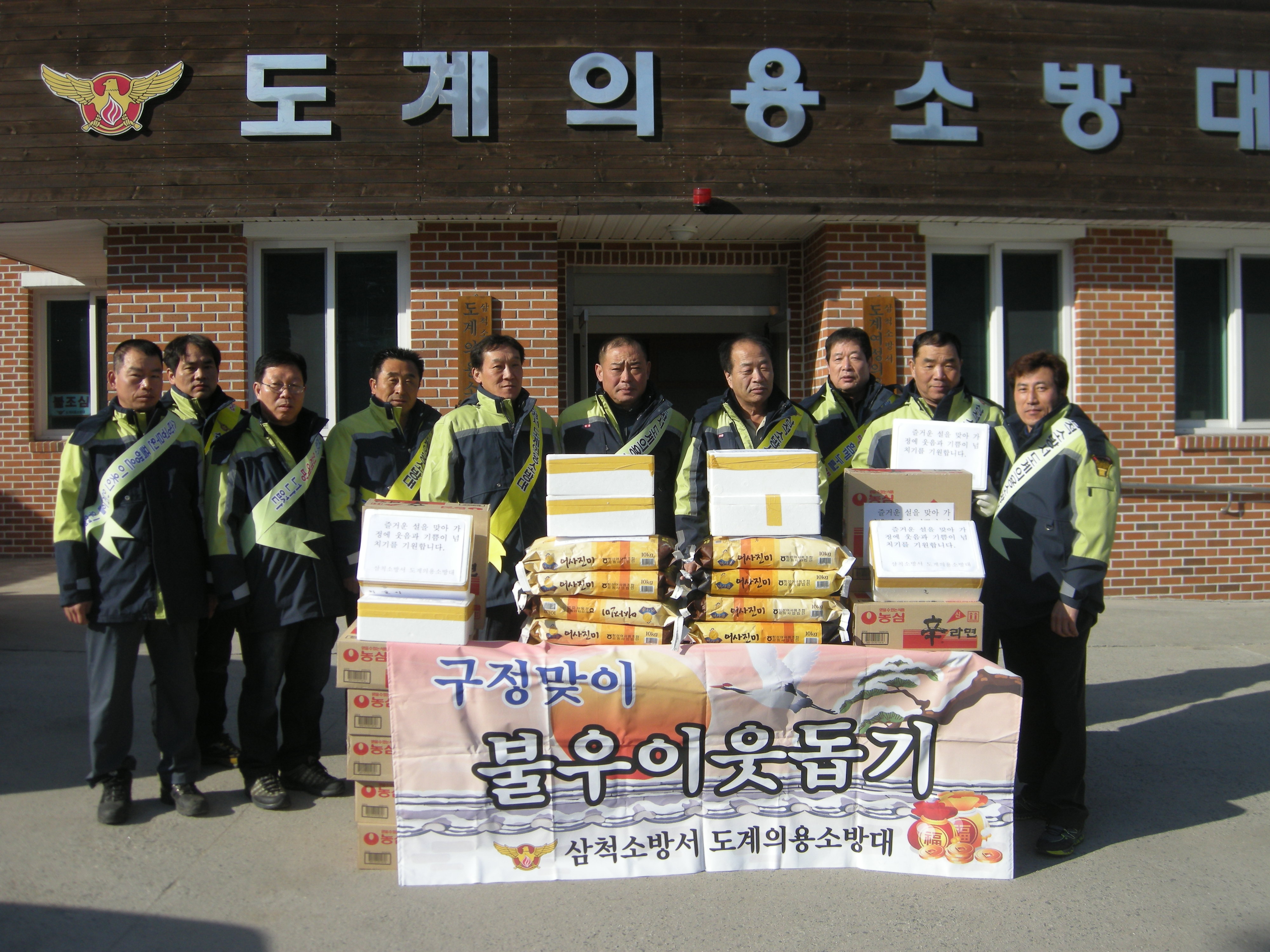 도계의용소방대(대장 김광우)는 2013년 2월 9일 구정맞이 불우이웃 도계읍사무소 사회복지과에서 4가구 추천을 받아 가구당 쌀 10kg 2포, 라면 2상자, 만두 2상장 이웃들과 함께 하였다
