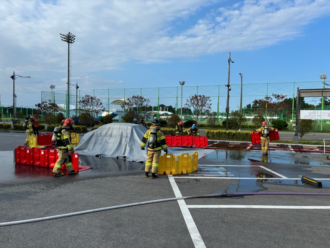 훈련에는 21명의 대원들이 전기차 화재 시 발생할 수 있는 고압 배터리 폭발 및 유해 가스 확산 등에 대한 대응 절차가 중점적으로 다뤄졌다. 또한, 현장에 배치된 다양한 소방 장비를 활용한 실전 대응 훈련이 이루어져 현장 대응력을 한층 강화했다.