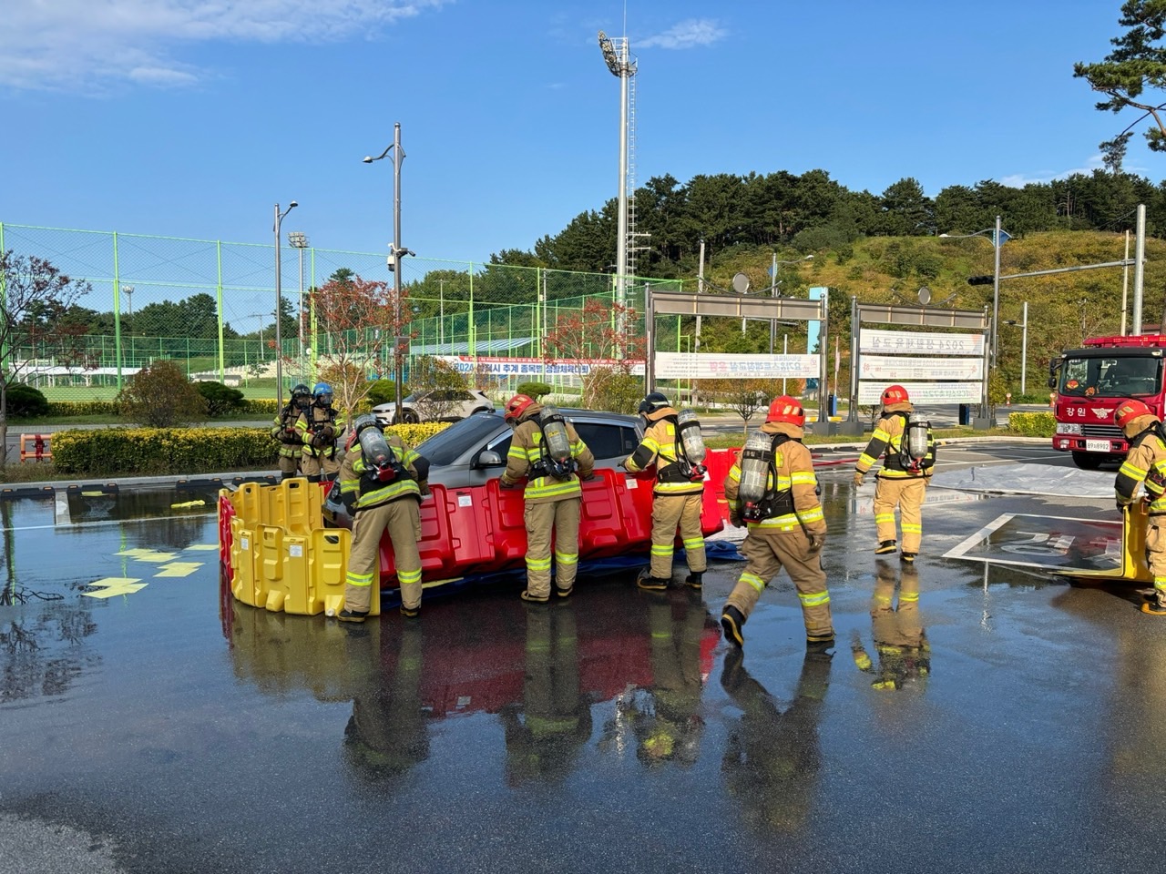 삼척소방서는 10월 23일 진행될 긴급구조종합훈련에 대비해 10월 10일 오후 3시, 삼척시민체육관에서 전기차 화재진압훈련을 예행 훈련으로 진행하였다.