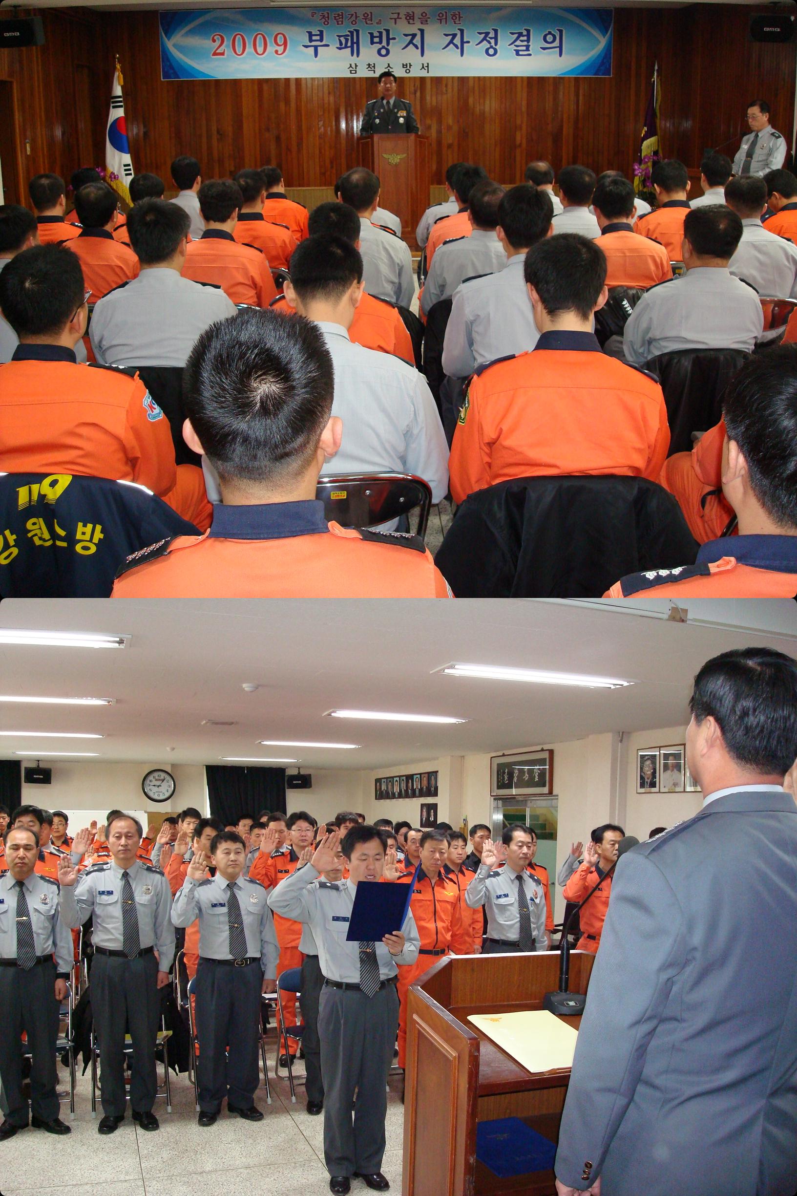 삼척소방서(서장 정경남)는 2월 2일(월) 오전 삼척소방서 대회의실에서 <청렴강원 구현을 위한 2009 부패방지 자정결의>를 다지는 시간을 갖고 전직원이 참여한 가운데 반부패 청렴다짐 서명, 행동강령 책임관(서장)이 반부패와 관련한 직원 정신교육을 실시했다.