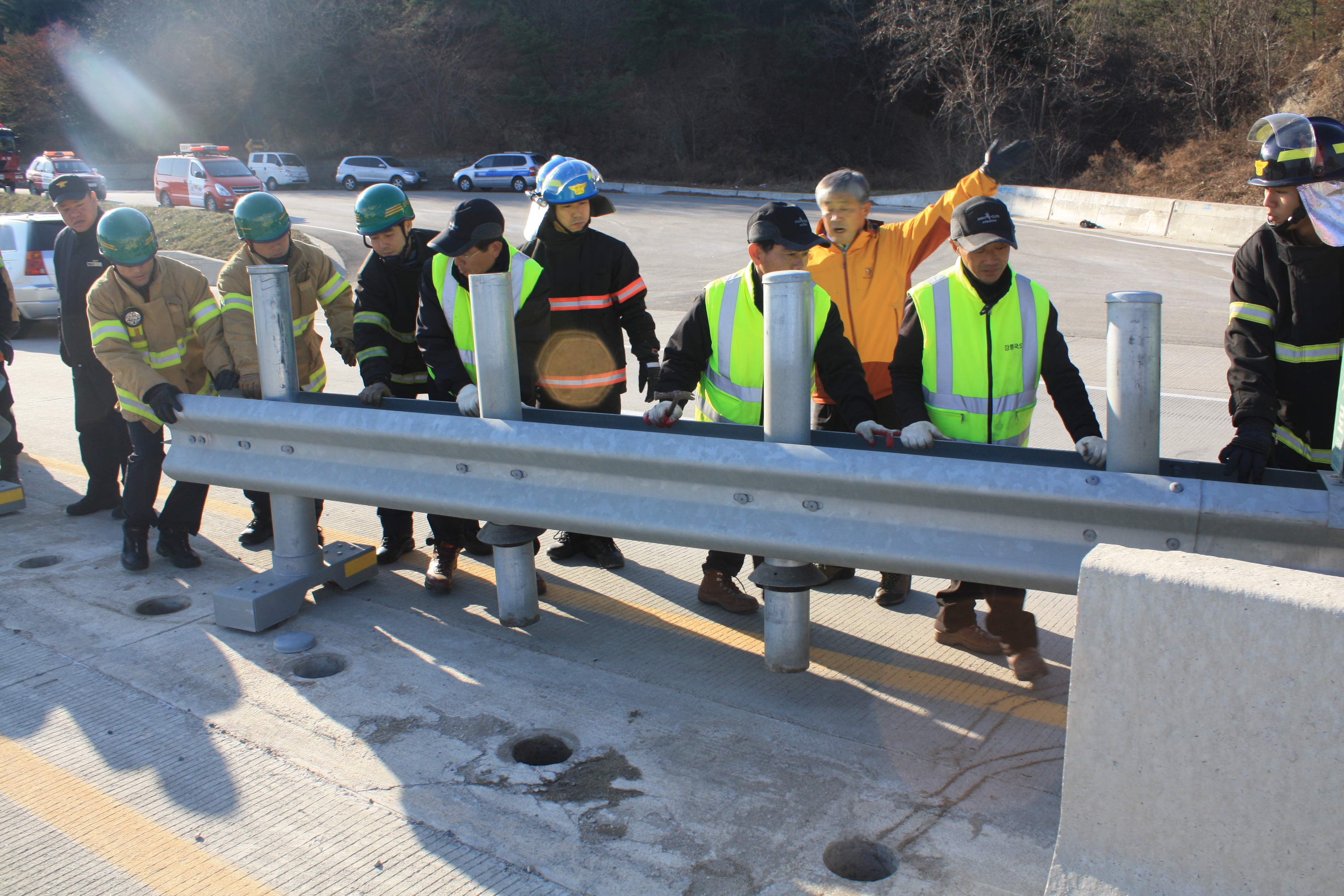 12월 13일 목요일 14시 원덕읍 임원리 국도상(삼척에서 원덕방향)에서 강릉국토관리사무소 비상대기소 앞 개폐식 중앙분리대를 개폐하는 훈련을 실시하였다.