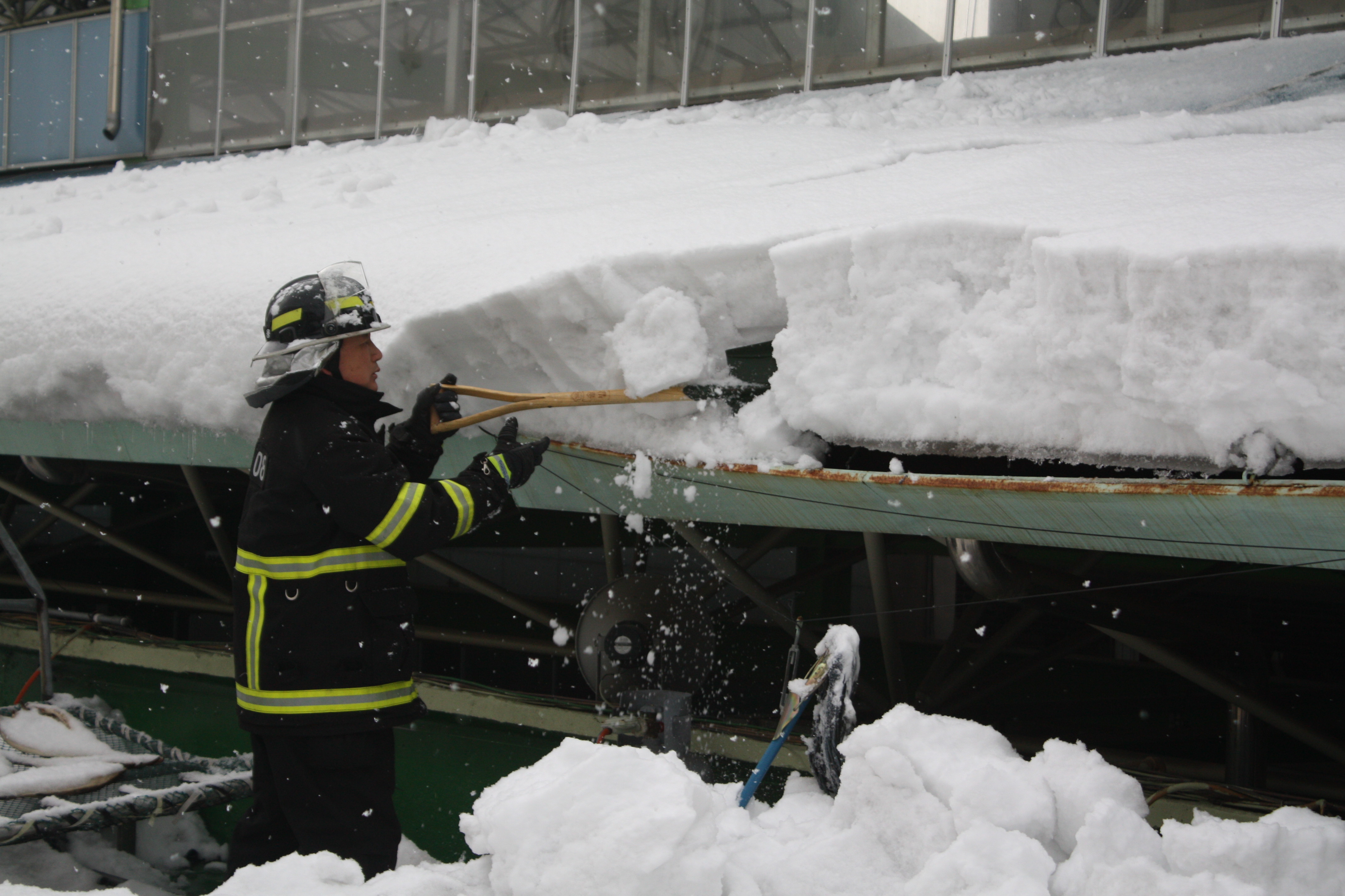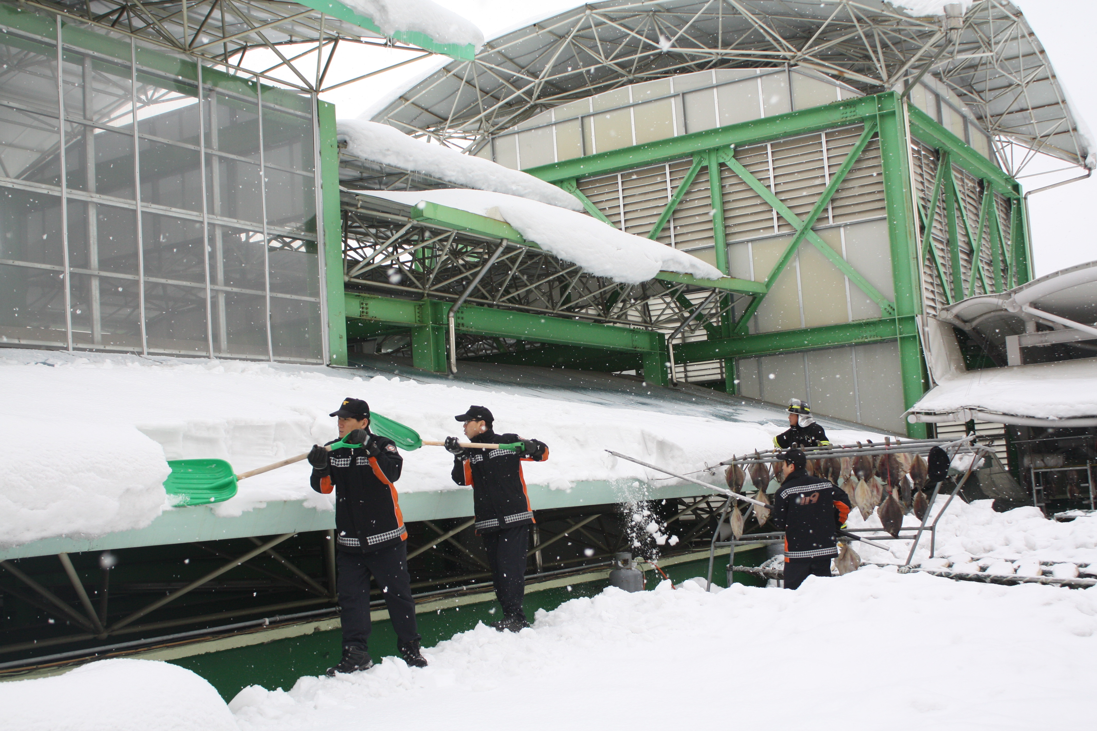 지난 2011년 2월 16일 삼척중앙시장 비가림막 붕괴사고 이후 새로 건설된 비가림막에 열흘간 계속되는 눈으로 무게가 가중되고 있어 사전에 붕괴 위험을 방지하기 위하여 소방서 직원 및 주민 20명이 힘을 합쳐 제설작업을 실시하였다.