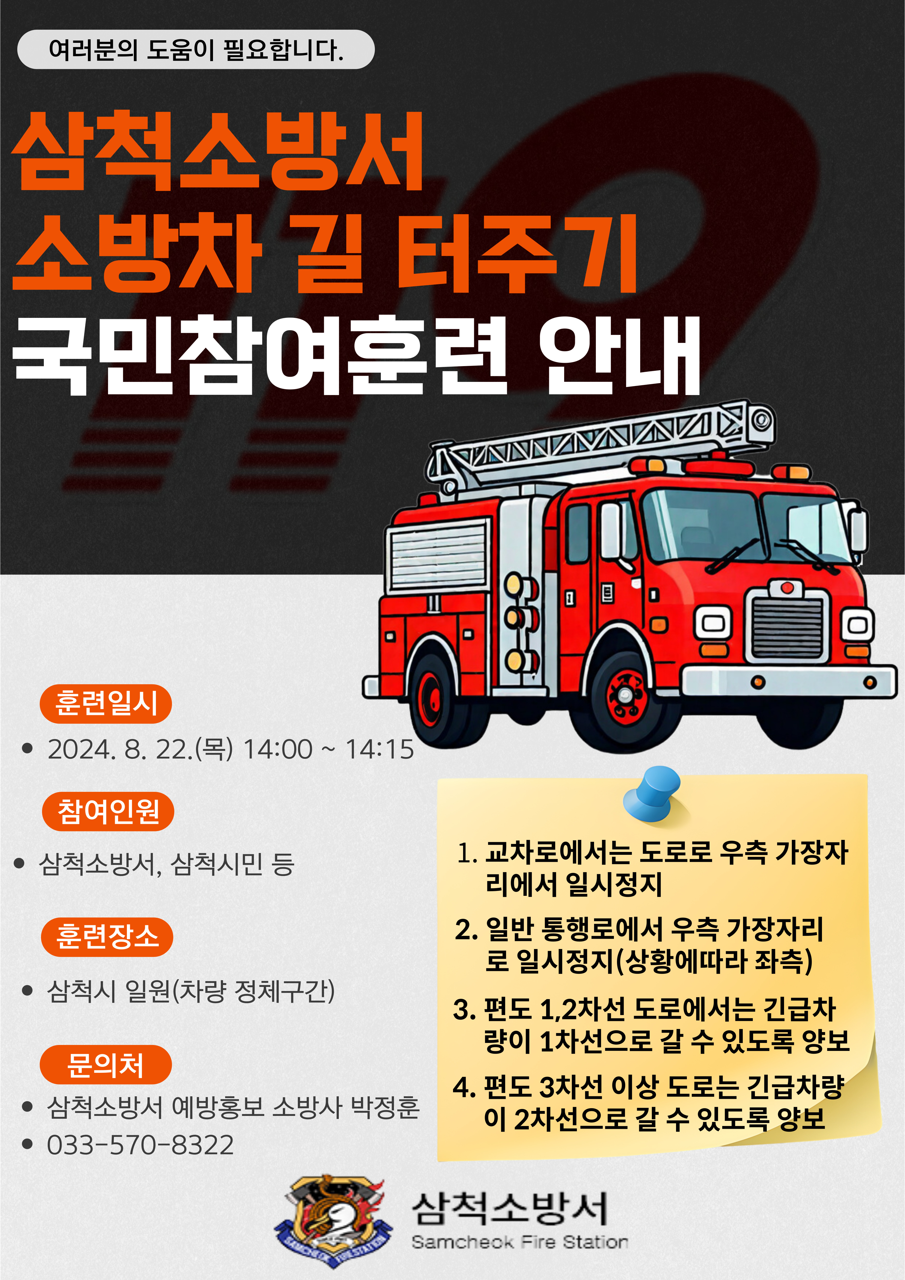 24년 8월 22일(목) 14시부터 15분간 「전국 동시 소방차 길 터주기 국민참여훈련」을 진행합니다 !!!