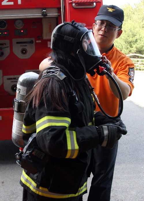 속초소방서가 4일 개최한 미래소방관 일터체험 119안전교실에 참가한 한 여중생이 소방관들이 사용하는 진화복과 장비를 착용해 보고 있다.