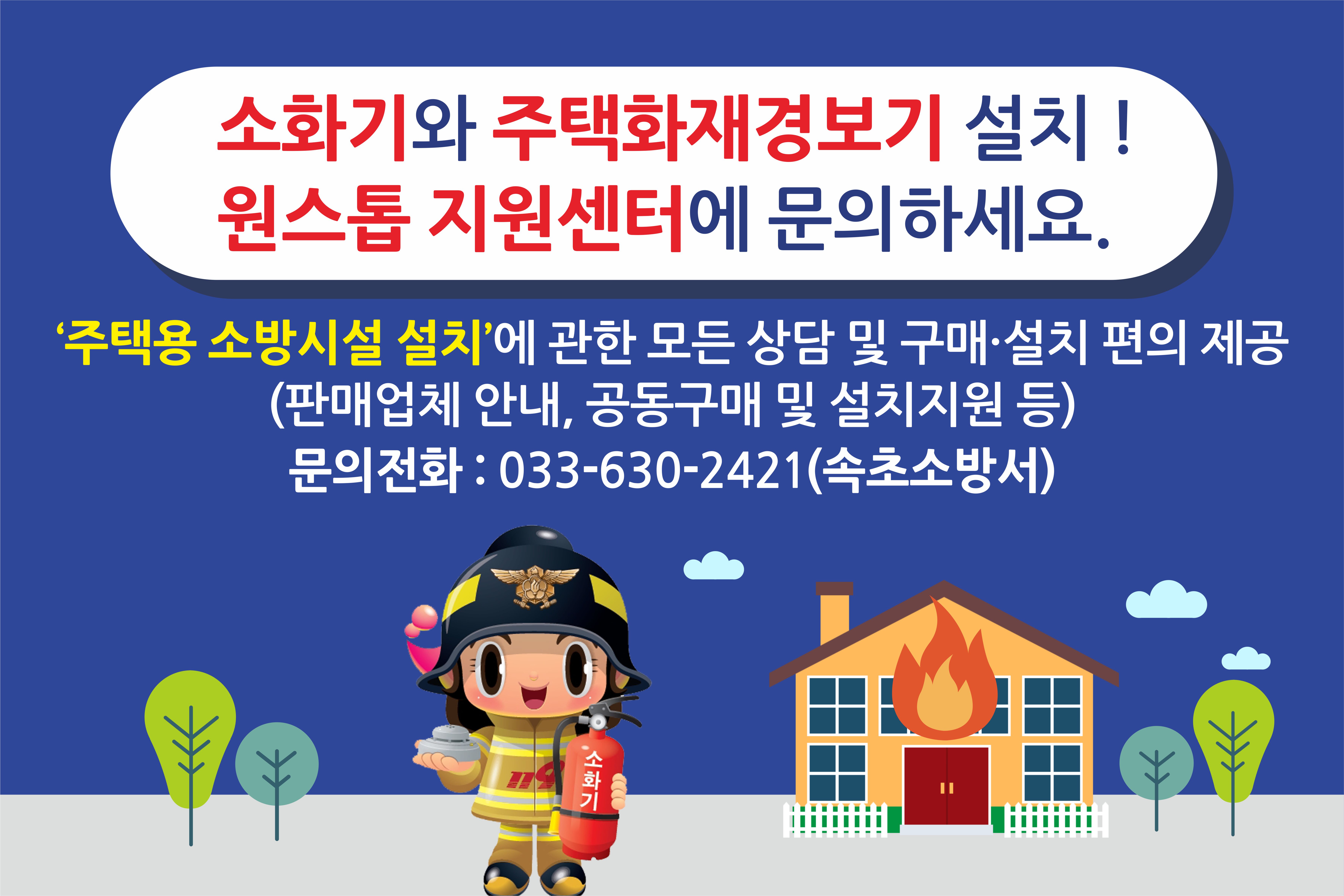 속초소방서(서장 김영조)는 주택용 소방시설(소화기ㆍ주택화재 경보기)의 구매와 설치 편의 제공을 위해 ‘주택용 소방시설 원스톱 지원센터’를 운영한다고 밝혔다.