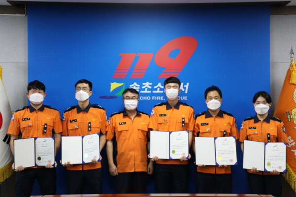 속초소방서(서장 염홍림)는 21일 오전 9시 소회의실에서 심정지로 쓰러진 시민의 소중한 생명을 살린 구급대원 6명을 대상으로 ‘하트ㆍ브레인세이버’ 수여식을 실시했다고 밝혔다.