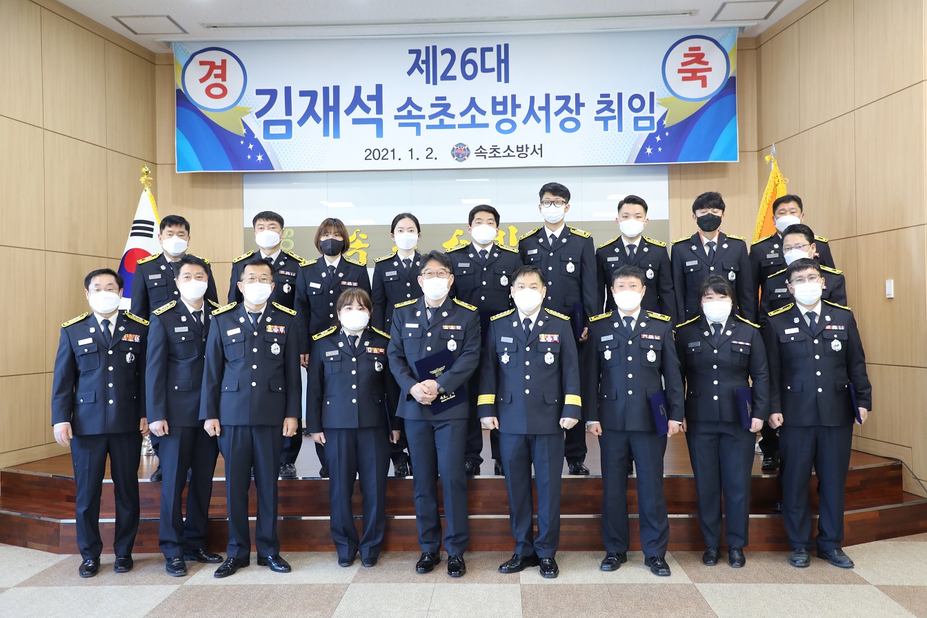 1월4일 강원 속초소방서에서 김재석 서장이 취임식을 한 뒤 직원들과 기념촬영을 하고 있다.