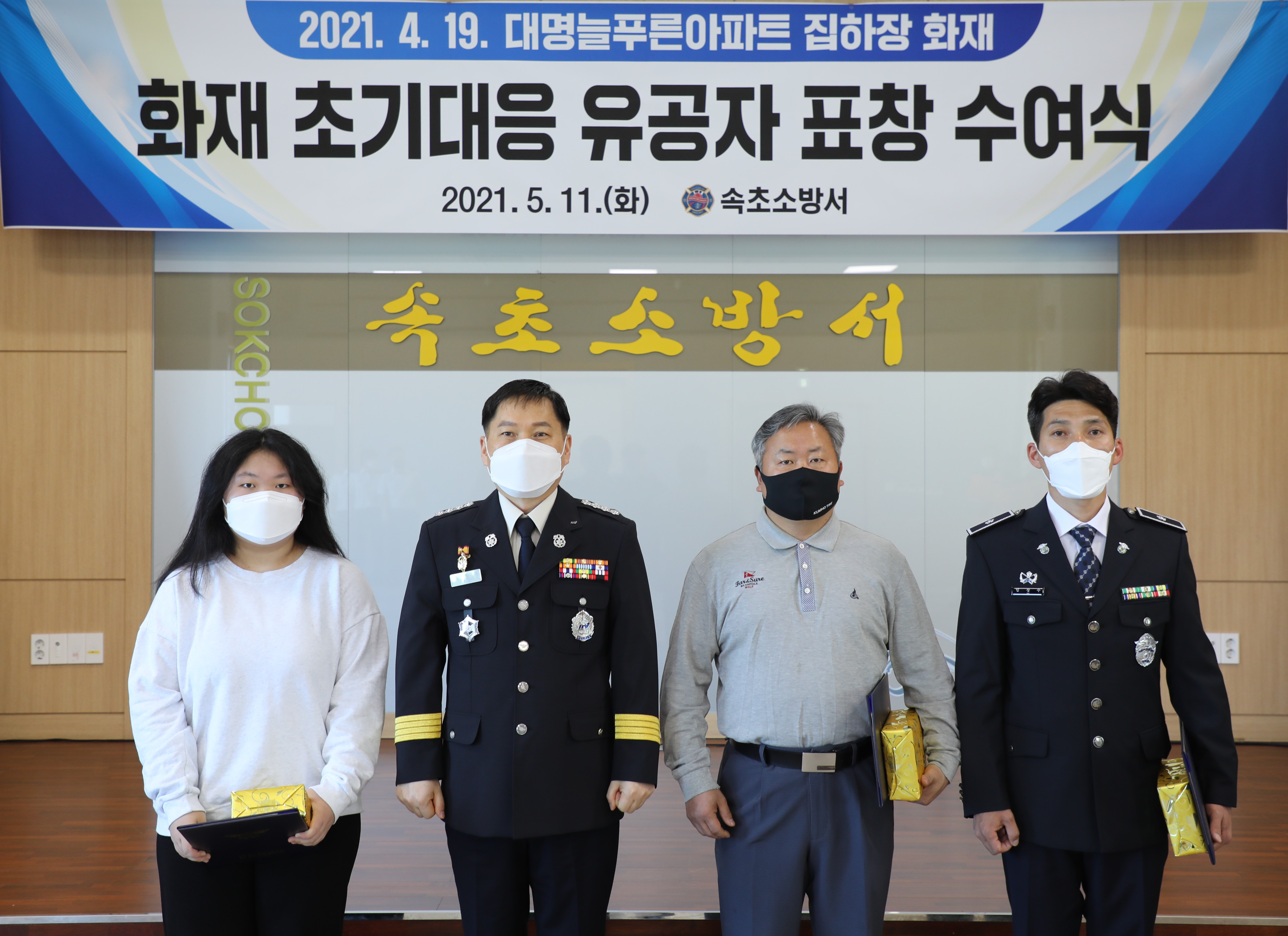 이들은 지난 4월 19일 오후 10시 속초시 교동 대명늘푸른 아파트 분리수거장 화재에서 신속하게 신고하고 소화기와 옥내소화전 등을 활용해 초기 대응했다. 10시 8분에 접수된 이 화재신고는 이들의 빠른 행동으로 7분 만에 진화 됐다.