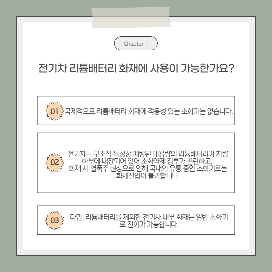최근 잇따라 발생하는 전기차 화재와 관련하여, 소화기로 인한 혼란 등을 방지하기 위해 안내하오니 참고하시기 바랍니다.