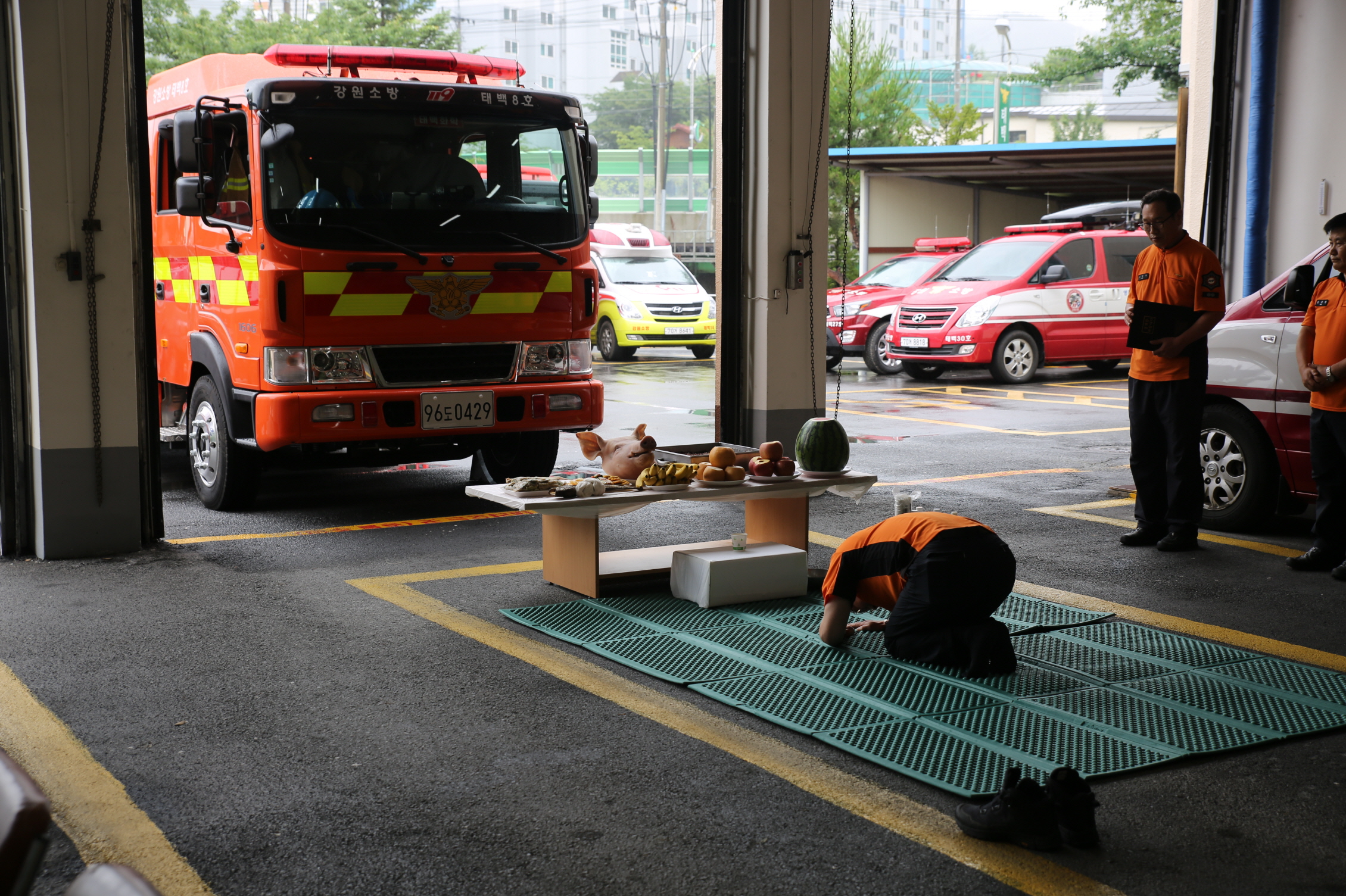□ 태백소방서(서장 최식봉)은 지난 14일 소방차량 차고에서 신규 배치된 소방차량의 무사고와 안전운행을 위한 안전기원제 행사를 가졌다.