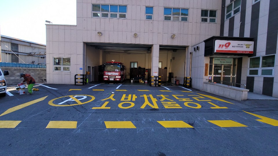 ○ 소방서는 주변 차량 통행이 많고, 소방출동로에 불법 주·정차 가능성이 높은본서와 화전·장성119안전센터를 대상으로 차고 앞 노면표시를 했다.
