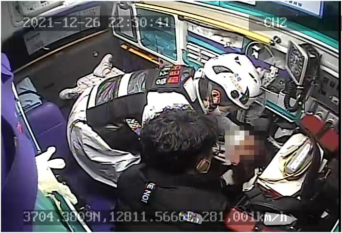 ◯ 사고를 목격한 정원용 대원은 즉시 차에서 내려 다수의 환자를 확인하고 응급처치 중이던 구급대원에게 소속과 1급 응급구조사임을 밝히고 환자평가, 경추부목 고정 등 응급처치를 도왔다.