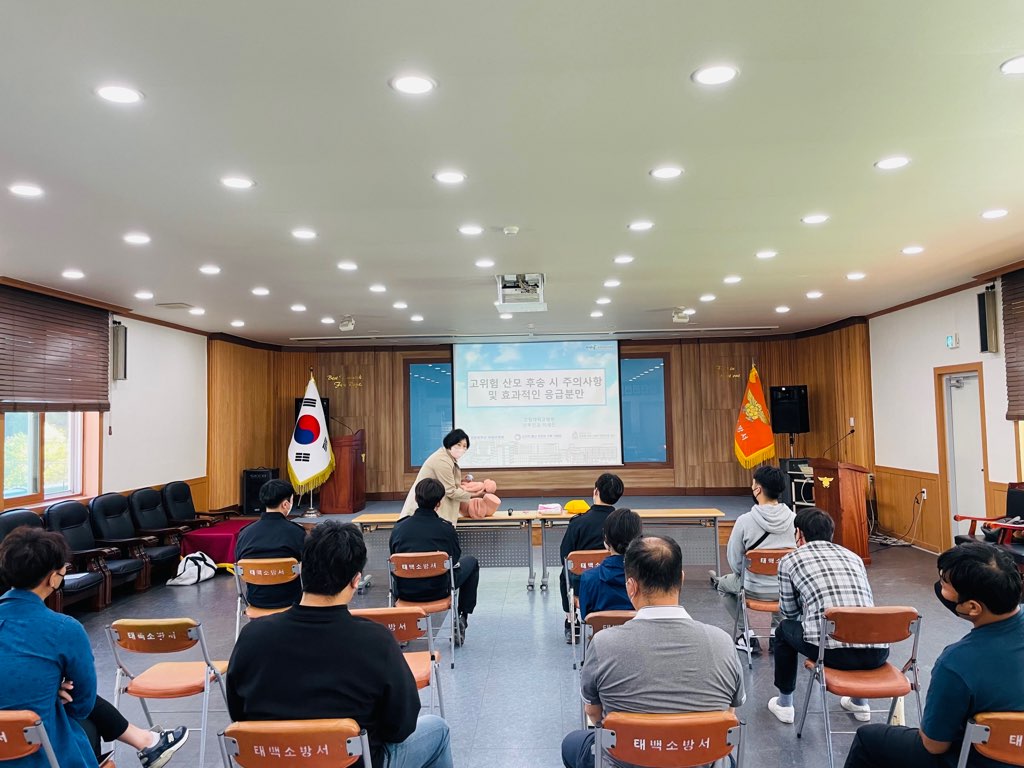 태백소방서(서장 김재석)가 29일 오전 10시 태백소방서 대회의실에서 강원대학교병원 산부인과 이세진 교수를 초빙해 태백소방서 구급대원을 대상으로 응급분만에 대한 사례별 응급처치 교육을 실시했다.