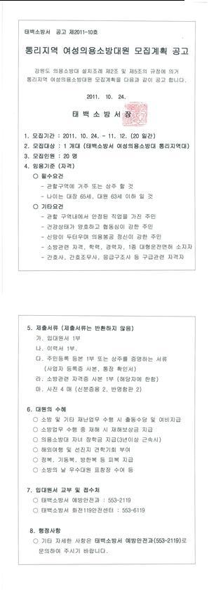 통리지역 여성의용소방대원 모집계획을 다음과 같이 공고합니다.