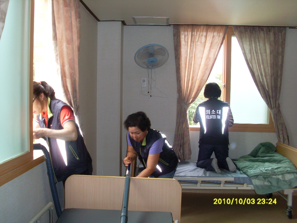 지정여의소대 (김명옥대장)는 매월 평심원으로 목욕봉사를 갑니다. 10월은 총무부가 가는 달입니다. 목욕봉사를 하러가서 작은음악회가 있는 관계로 우리는 대청서를 하었습니다. 청소를 열심히 하고 있는데 할머니께서 오셔서 속삭이시는 거예요 참 고맙다고 창틀까지 이렇게 깨끗하게 닦아주어서라고 하시며 너무나 좋아하시는 모습을 보고 다음부터는 목욕봉사만 해드리지 말고 청소도 깨끗이 해드려야겠다고 마음 먹고 돌아왔습니다. (감사합니다 행복하세요)
