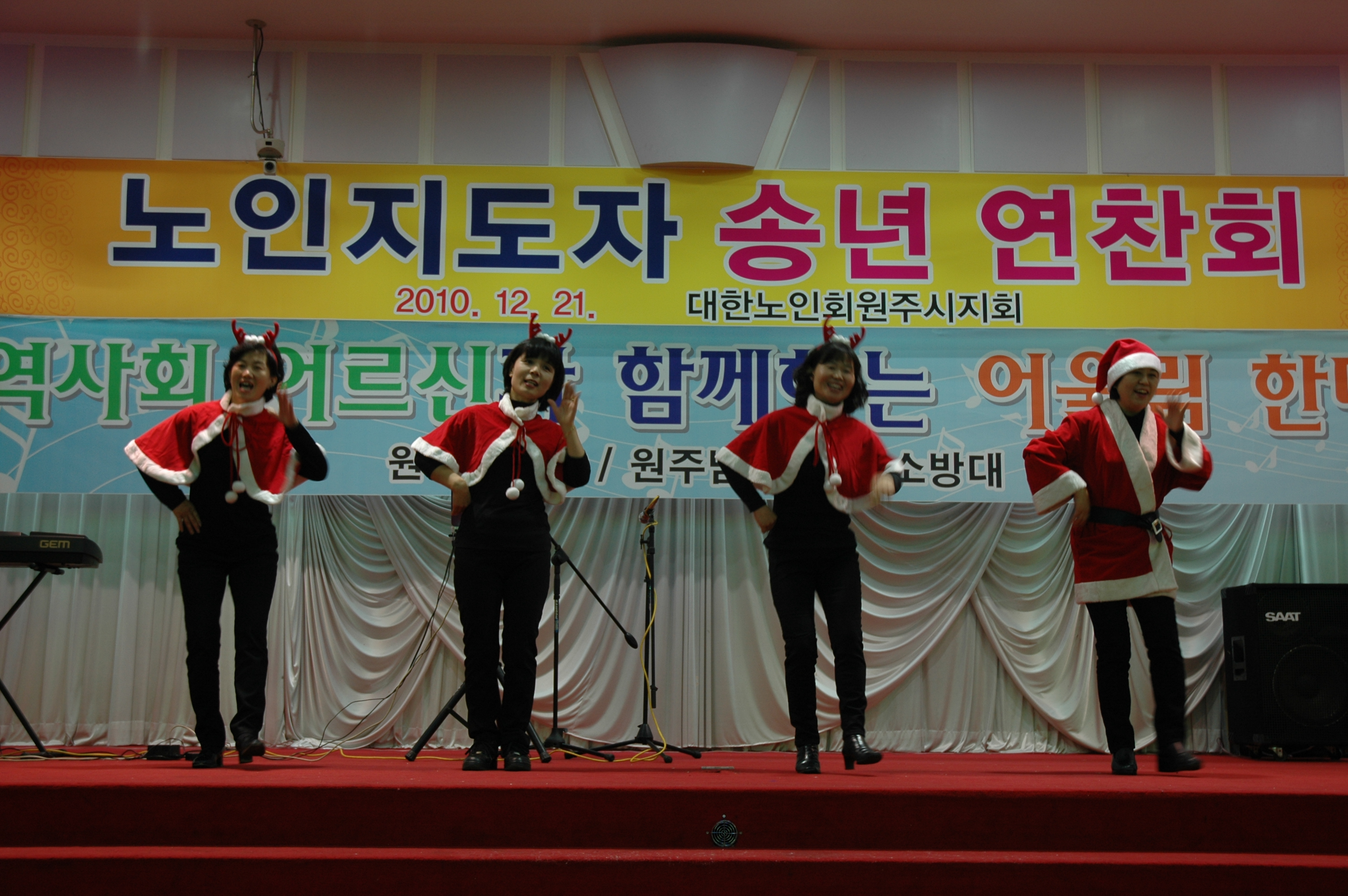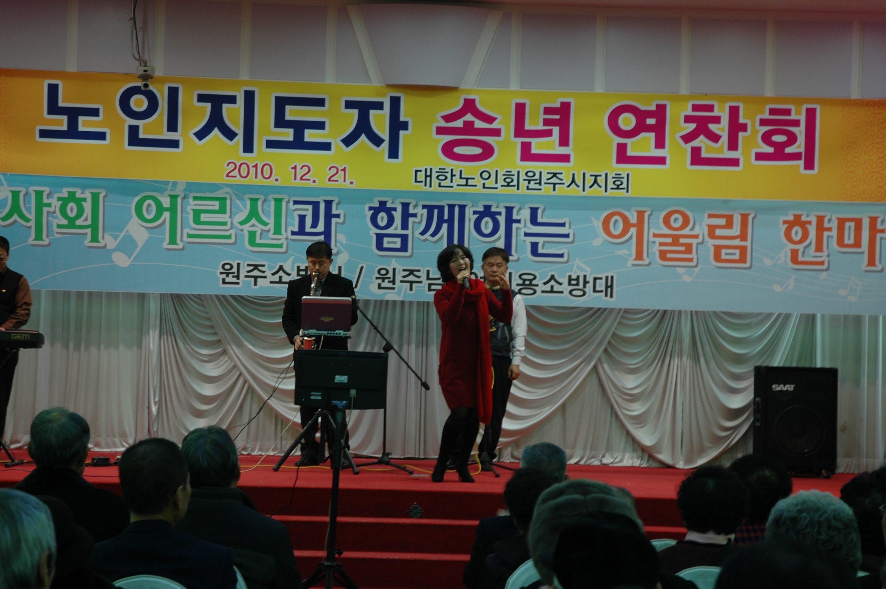원주의용소방대(대장 조성일),원주여성의용소방대(대장 이현자)는 12월22일 10:30부터 원주중앙웨딩홀에서 지역어르신과 함께하는 어울림한마당을 어르신500명이 참가한 가운데열렸다. 이날행사에는 원주의용소방대 119밴드팀과 원주여성의용소방대 댄스팀이 1시간 공연을했다.
