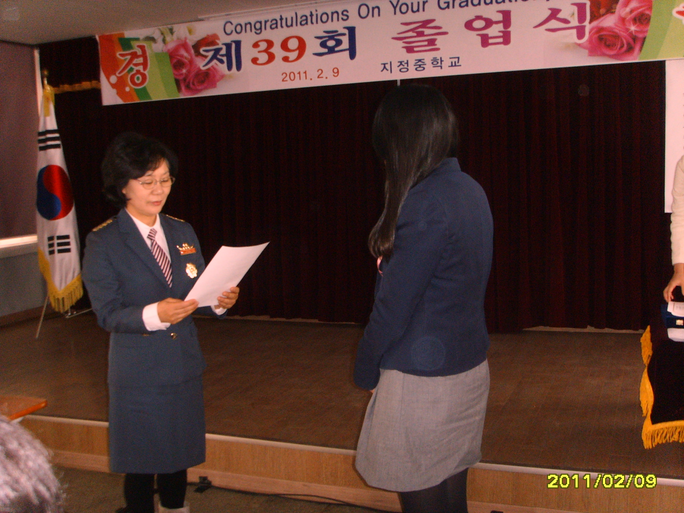 2011년 2월 9일(수)에 지정여성의용소방대 박인수 대장님과 지정의용소방대 한현수 대장님께서는 지정중학교의 졸업생15명을 한마음으로 축하하시고 장학금(10만원)과 장학금(20만원)을 2명에게 수여하시고 중학교 학생들의 졸업 축하 작은 콘서트를 보고 오셨습니다.