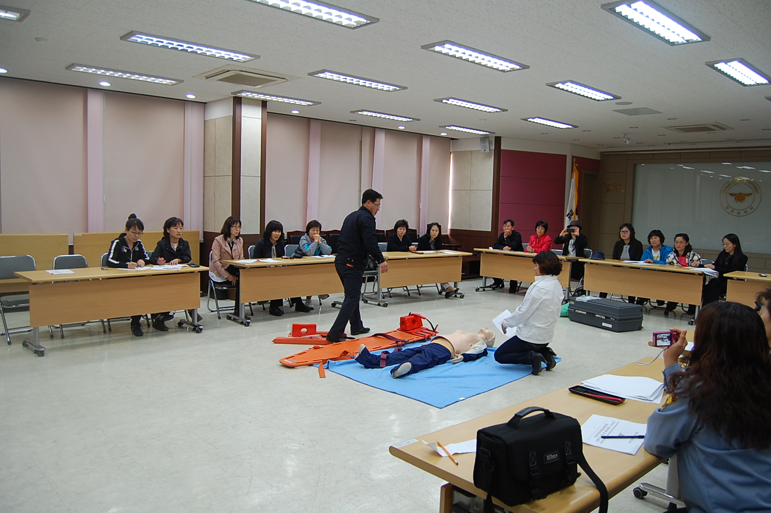 경기종목은 심폐소생술, 부목고정응급처치 2종목으로서 소방장 심준택(명륜센터), 소방장 김주현(예방안전과)님이 당일 심판관의 자격으로 강원도지사기 여성대응급처치 경연대회 기준에 맞게 논란의 여지가 있는 부분 및 경기요강과 평가에 대해서 상세하게 설명하고 질문 받는 형식을 취하였습니다.