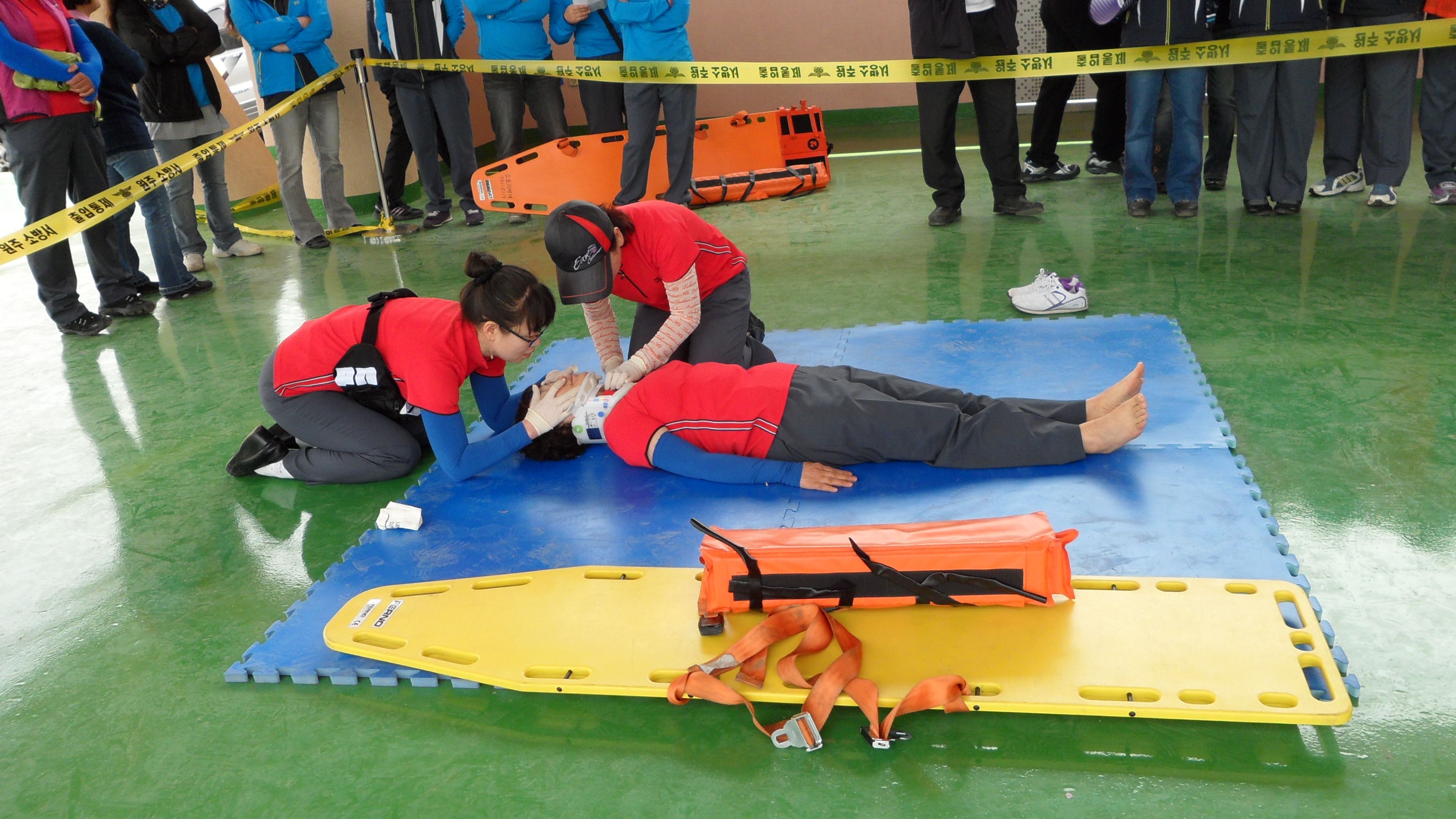 지정의용소방대는 호수매고 이어달리기를 하고 여성대는 부목과 심폐소생술을 하였습니다.그리고 여성대에서는 에어러빅을 시범으로 보였습니다