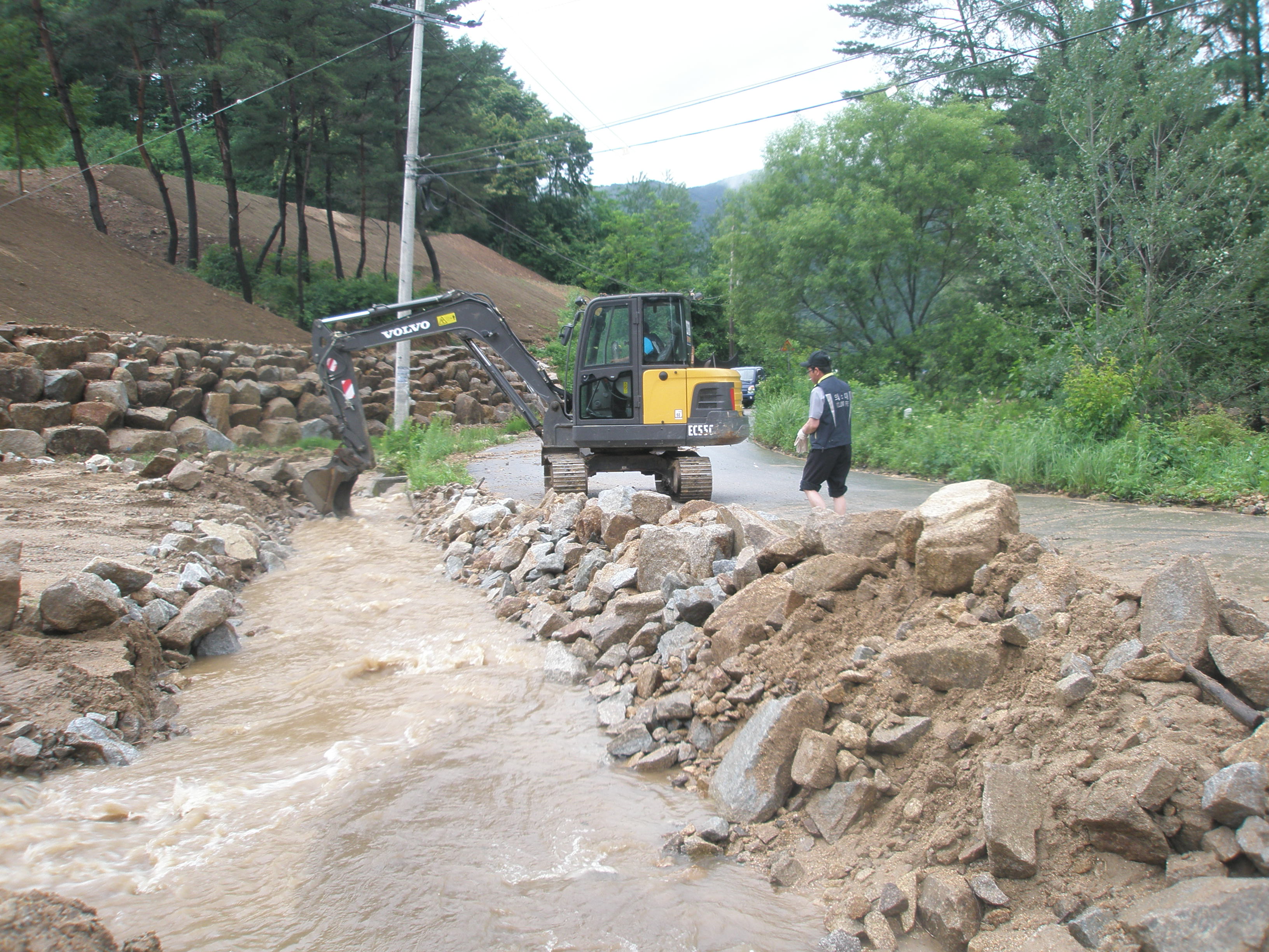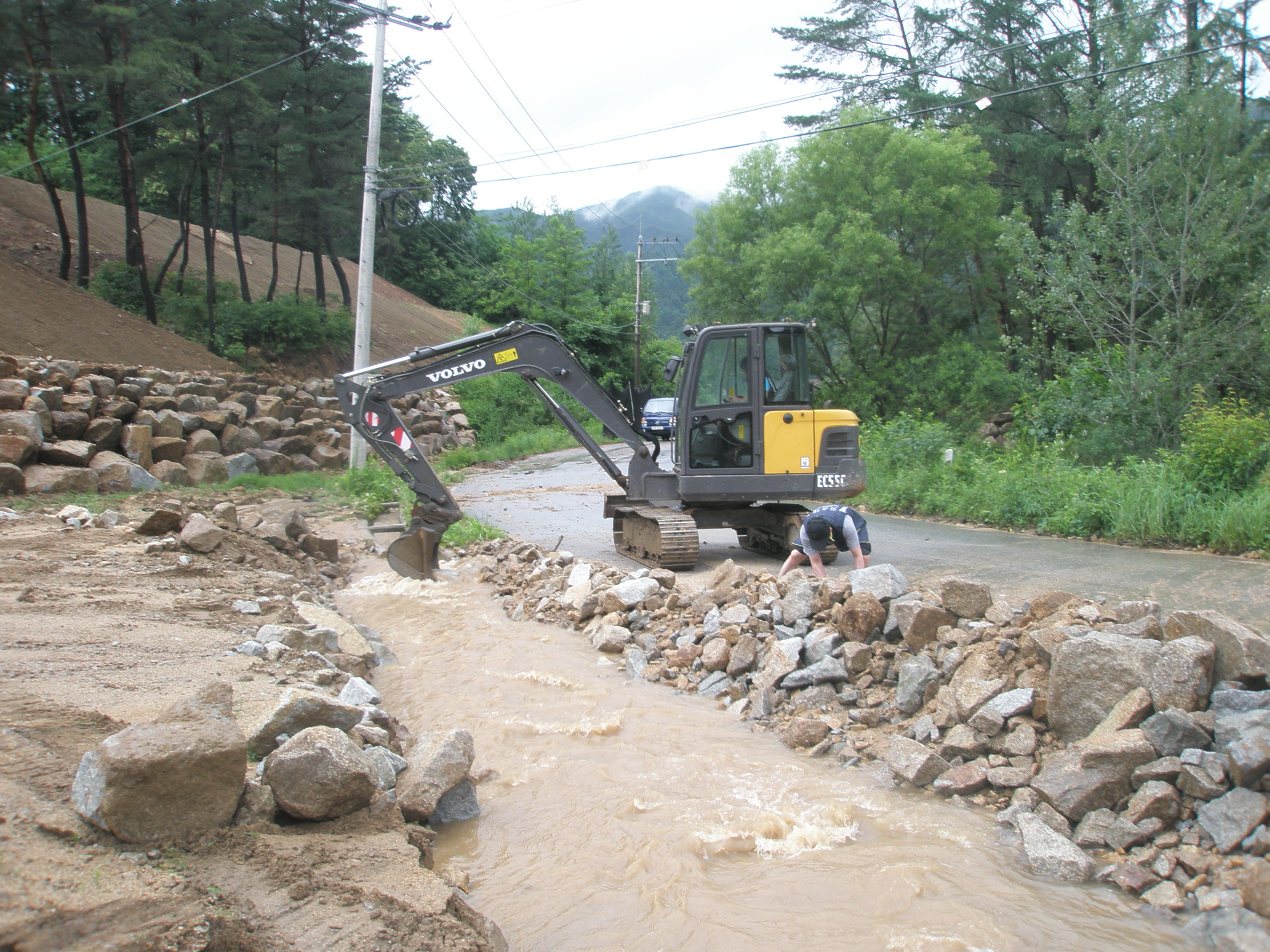 도로 및 농경지로 흐르는 물을 굴삭기를 동원 정비를 하였습니다.