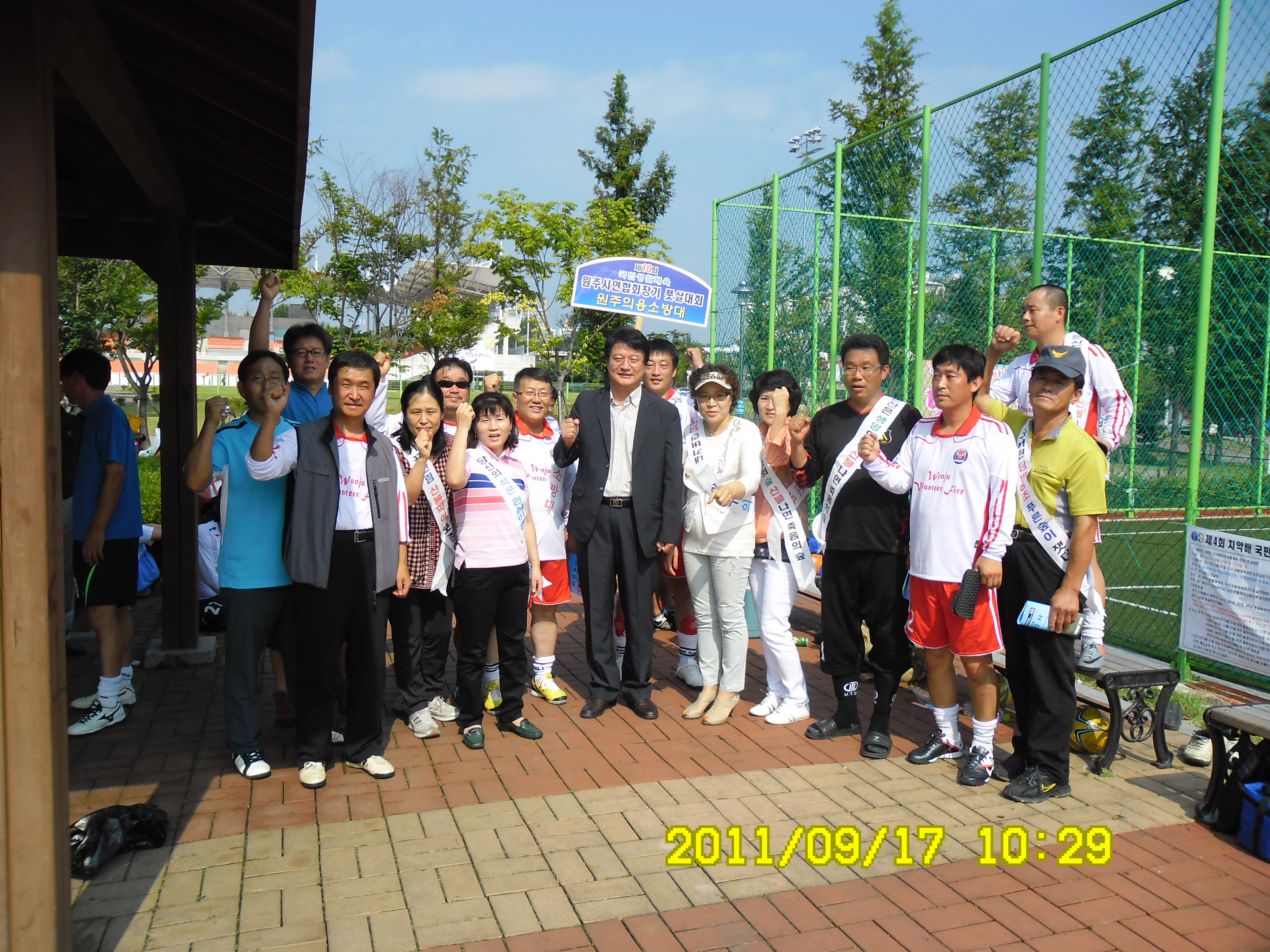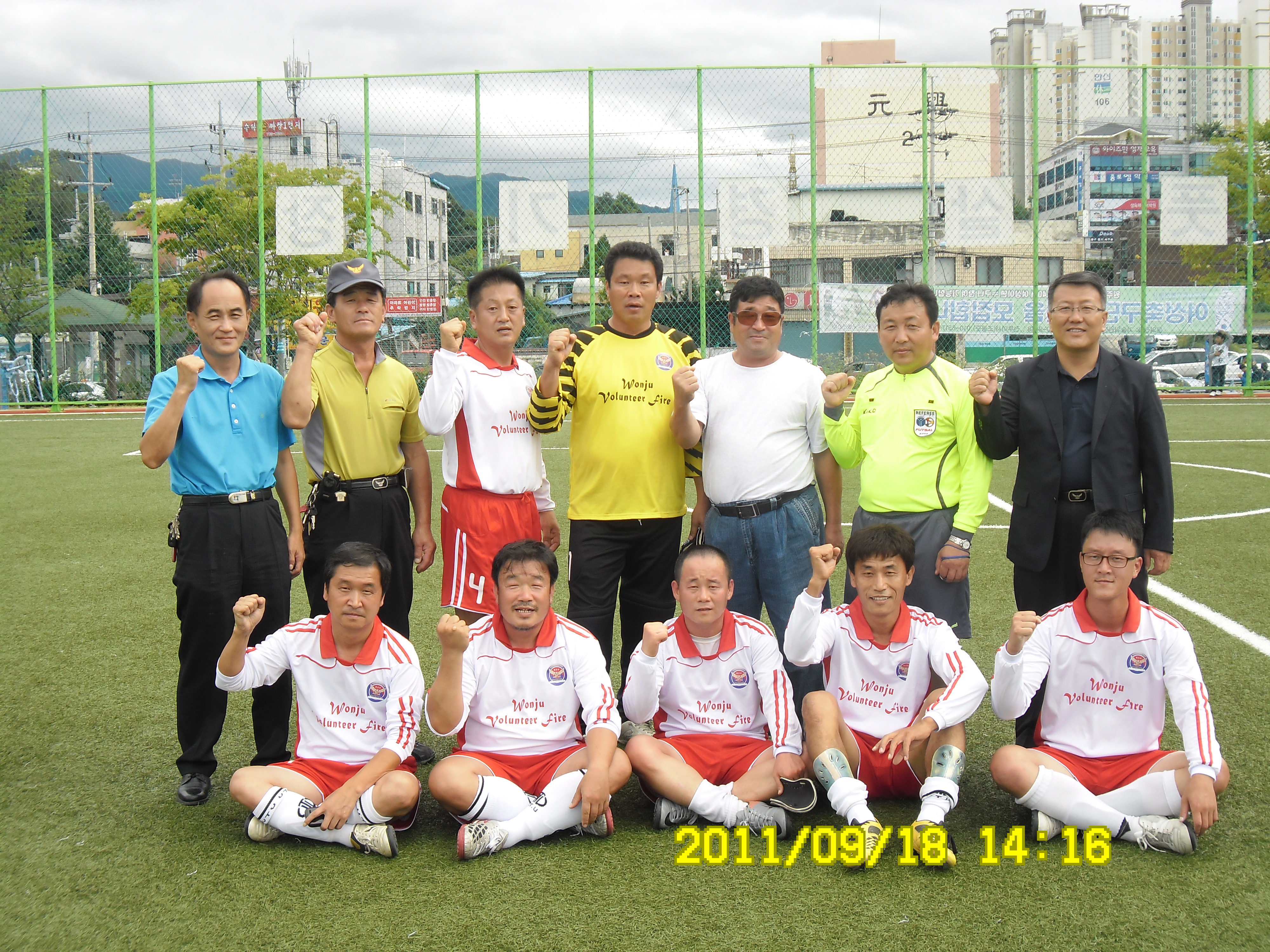 원주의용소방대(대장 조성일)는 9월17-18일 원주풋살구장에서 원주시 풋살대회에 참가하여 6개팀이 참가하여 2무3패의 중간성적으로 거두었습니다. 이어서 응원나온 원주여성의용소방대(대장 이현자)외 대원들과 풋살경기장 주위를 돌며 가을철 불조심 홍보황동도 하였습니다
