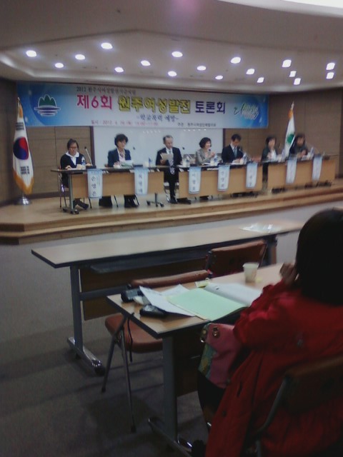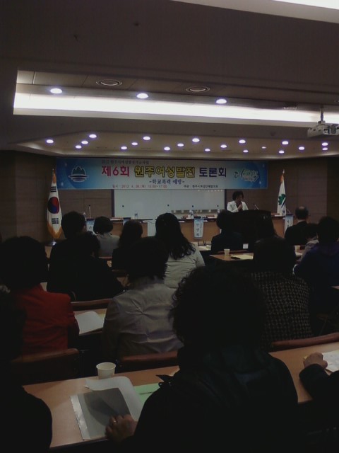 흥업여성대(대장오오석)에서는 2012년 4월 26일 오후3시부터 원주시청 다목적홀에서 열리는 `제6회 여성발전토론회'에 참석하과 왔습니다.원창묵원주시장님, 지은희 원주시여성단체협의회장,여성단체협의회원등 200여명이 참석하였습니다.자유롭고 안전한 지역사회를 만들이 위한 "학교폭력예방"을 주제로 토론이 진행되었습니다.학교폭력 예방을 위한 역활과 실천방안을 제안하고, 자유롭고 안전한 지역사회만들기 위해 저희 여성의용소방대원들도 힘써 돕겠습니다.