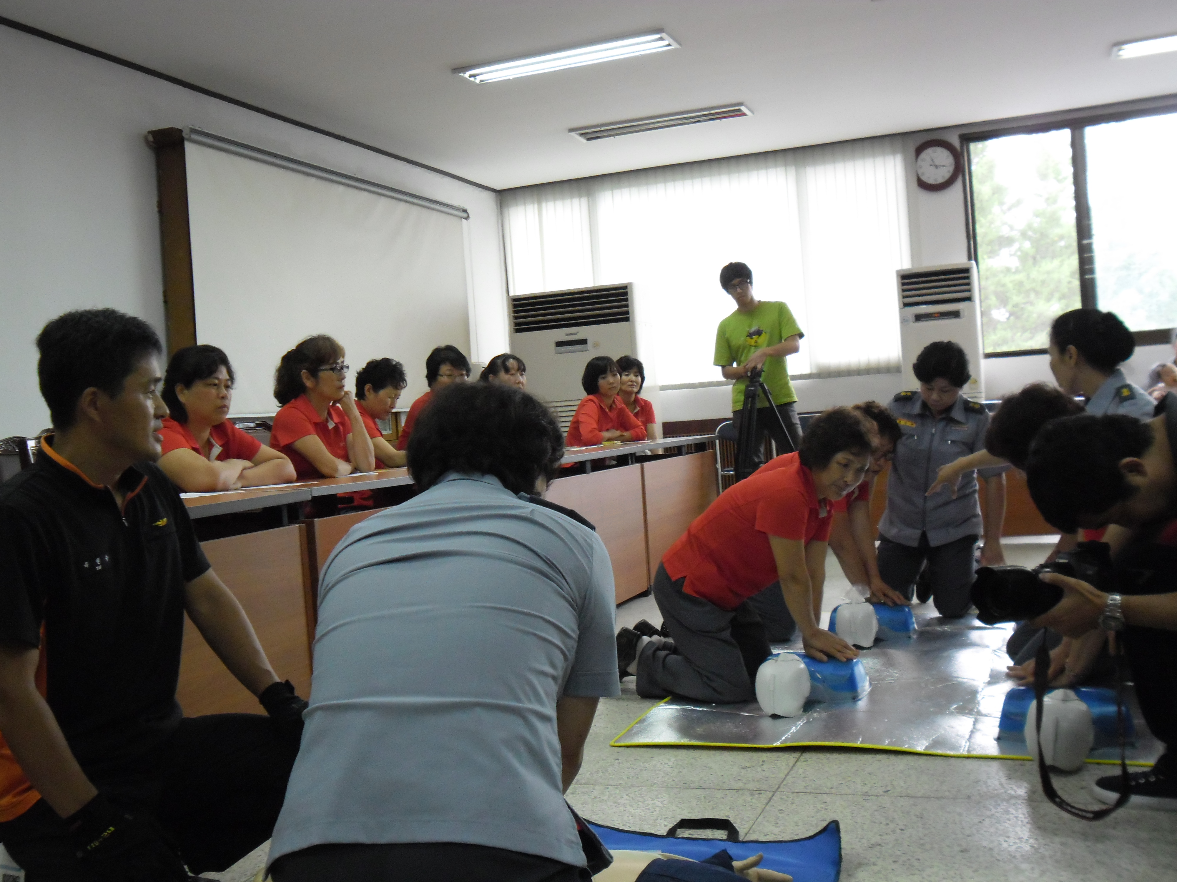 현장대응과 구조구급대 유일수 구급대장님을 교관으로 모시고 심정지환자에게 실시하는 응급처치법인 CPR교육 (흉부압박 및 자동 제세동기 사용법) 과 이물질에 의한 기도폐쇄 환자에게 실시하는 복부밀어내기법의 처치방법 등의 실습과 더불어 이후의 봉사활동 계획과 9월에 평창에서 개최될 응급처치기술경연대회에 관한 토의도 빠트리지 않았답니다.