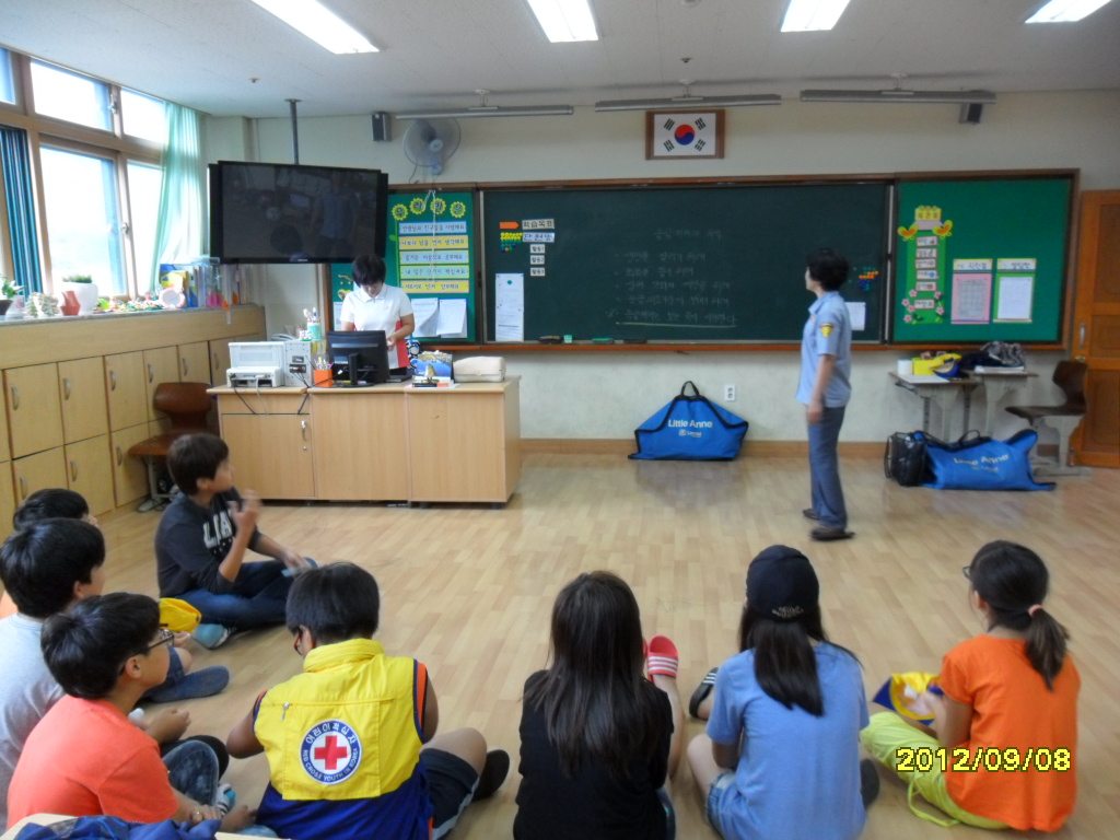 소초여성의용소방대(대장 윤금순) 서무반장 여주화 대원은 지난 9월8일 토요일 무실초등학교 6학년5반 학생 15명을 대상으로 응급처치교육을 실시하여 소방홍보에 일조하셨답니다.