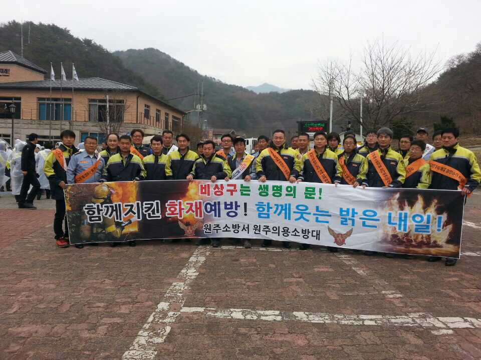 원주의용소방대(대장 조성일)는 3월29일 토요일 대원 38명이 참가하여 치악산 구룡사에서 불조심에 대한 예방과 안전에 대해 주말을 이용해 산에 온 등산객들에게 화재로부터 보호하자는 캠페인을 하였습니다.