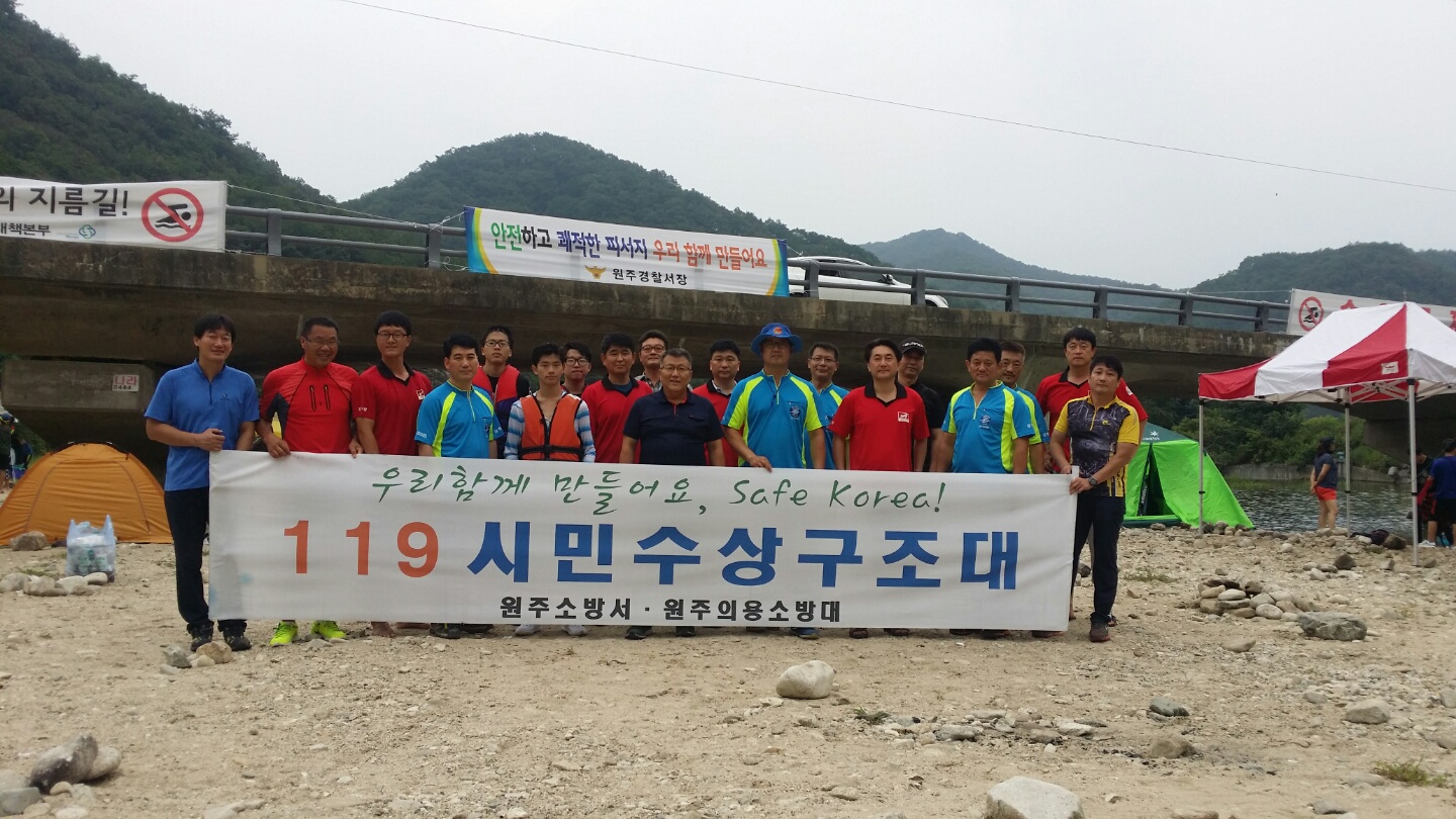원주남성의용소방대(대장 조성일)는 2015년 시민수상구조 칠봉유원지 근무가 7월18일부터 8월16일까지 실시했습니다. 1건의 사고도 없이 대원 모두가 근무를 잘해주신 덕분입니다.