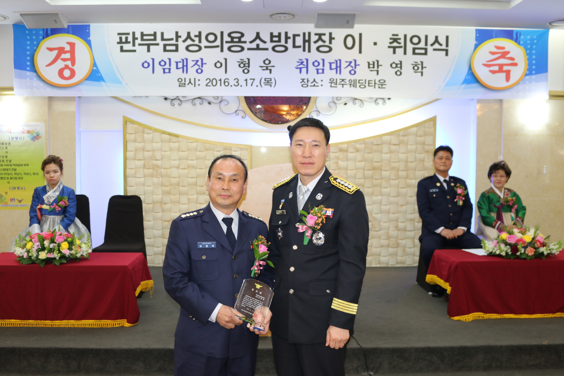 원주소방서(서장 진형민)는 17일 오후 5시 원주웨딩타운에서 주요 내빈 및 지역사회 주민 등 100여명이 참석한 가운데 이임 이형욱 취임 박영학 판부남성의용소방대장의 이․취임식을 가졌다.