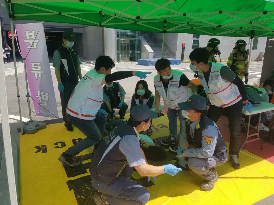 혁신도시내 관광공사 정문에서 민.관,군 합동의 화재발생시 대처요령및 진압에 대한 훈련을 실시 하였습니다.