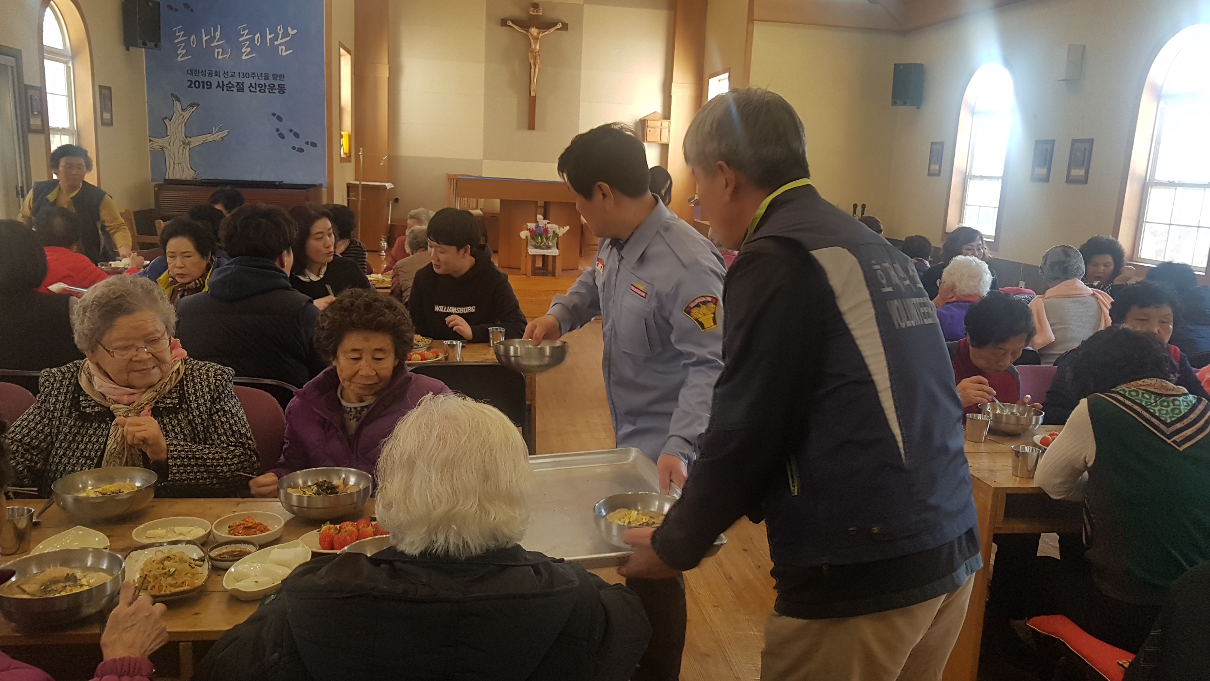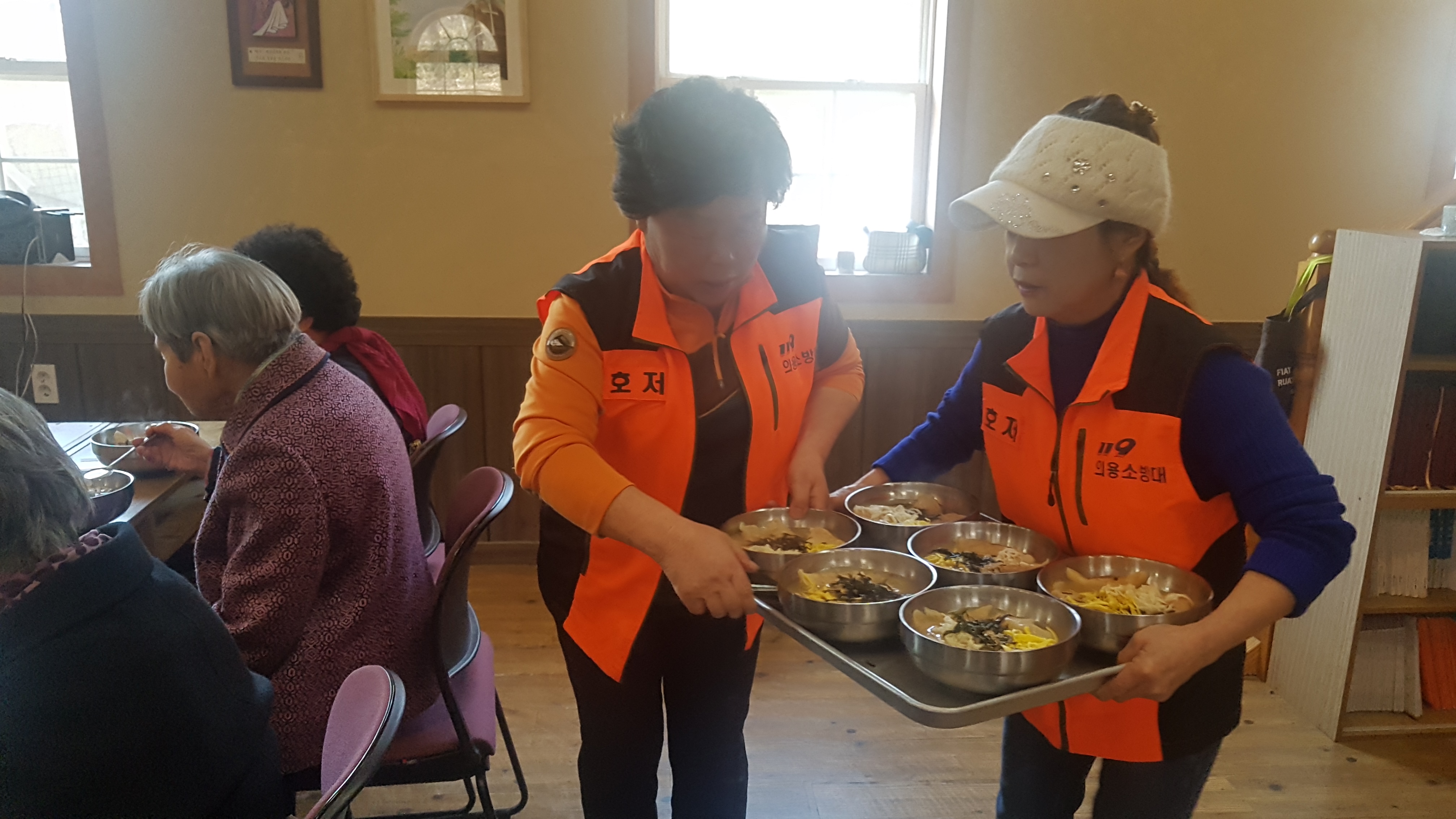 어르신들에게 점심식사로 만두국을 끓여 드리는 봉사활동 실시