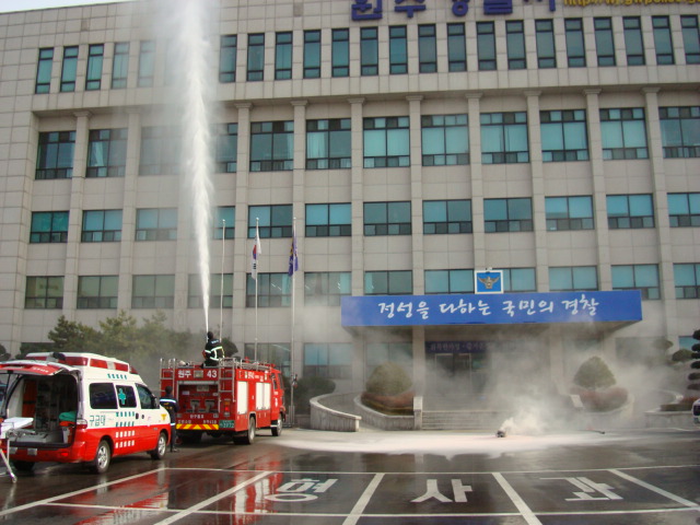 원주소방서(서장 조근희) 단구119안전센터 관할내 17일 10:00, 11:00 봉산동 원주경찰서 및 관설동 코아루@에서 원주경찰서 자위소방대와 옥내소화전 연결하여 방수훈련 및 방수포훈련, 아파트내 굴절차 이용 인명구조 검색훈련 등 겨울이 오기전 소방훈련을 실시하였습니다.