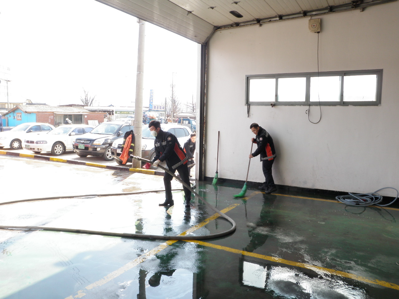 원주소방서(서장 박창진)문막119안전센터(센터장 전인덕)에서는 금일 오후 차고 물청소를 실시하였습니다. 화창한 날씨만큼이나 기분도 상쾌해졌습니다.