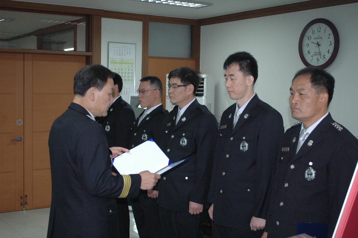 원주소방서(서장 박창진)는 4월 7일(목) 09시 서장실에서 근속승진자 6명에 대한 인사발령장 수여 및 신고식을 가졌다.