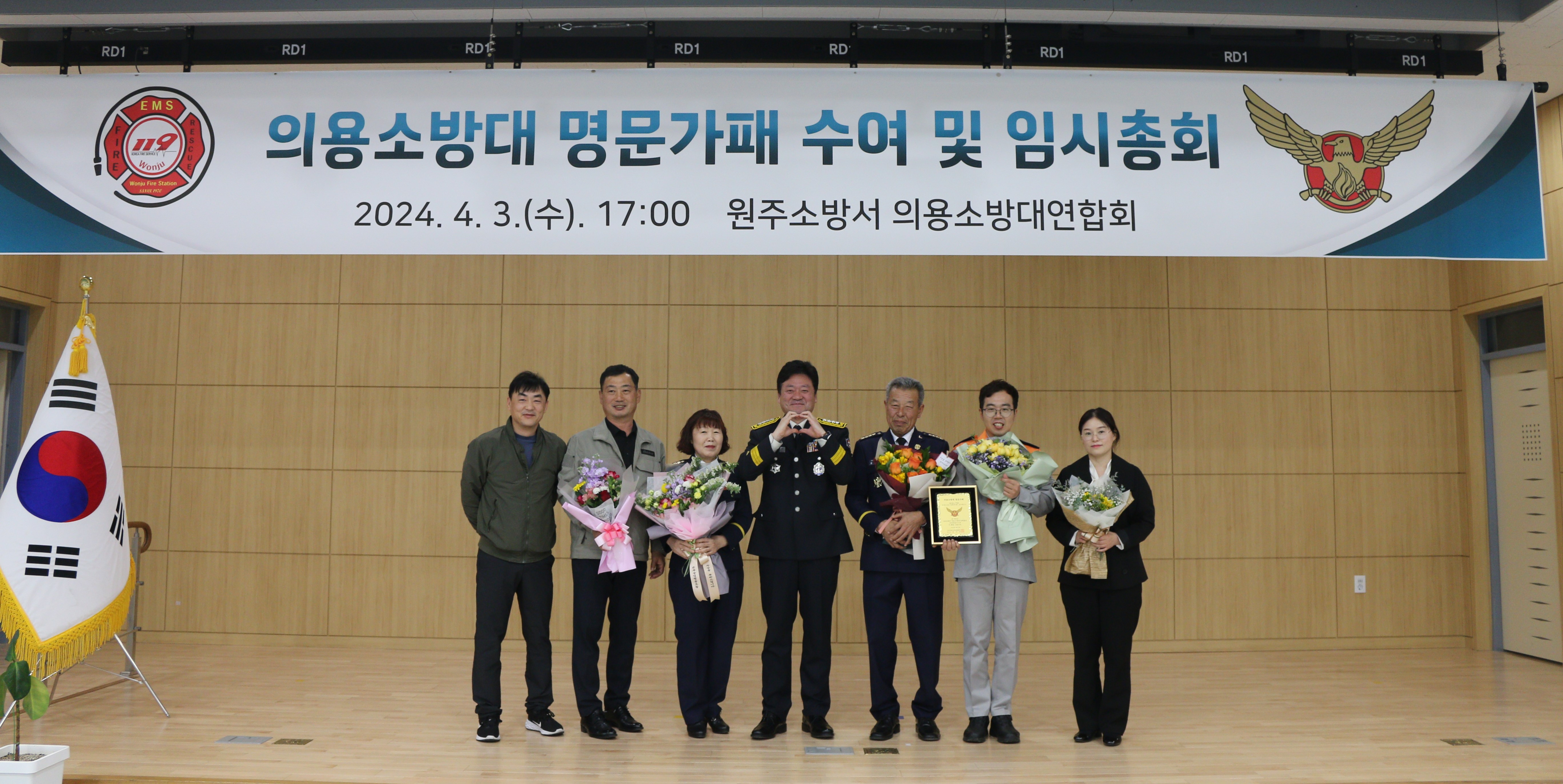본문 시작□ 원주소방서(서장 이강우)는 3일 오후 17시 3층 대회의실에서 제3회 의용소방대의 날 기념 명문가 의용소방대원에게 명문가패 수여식을 진행했다고 전했다.