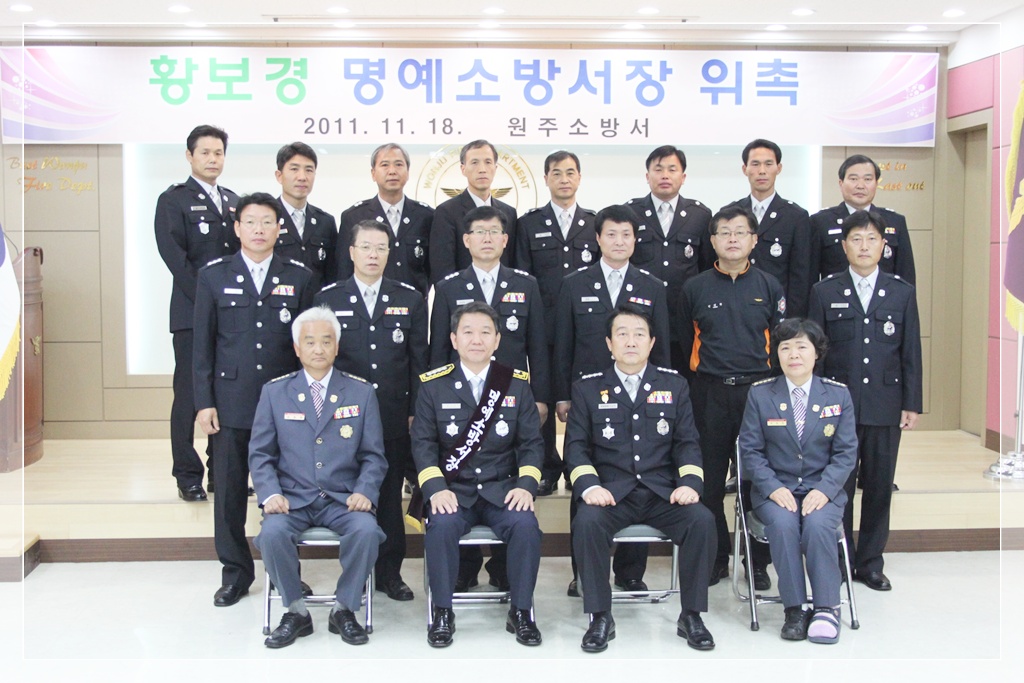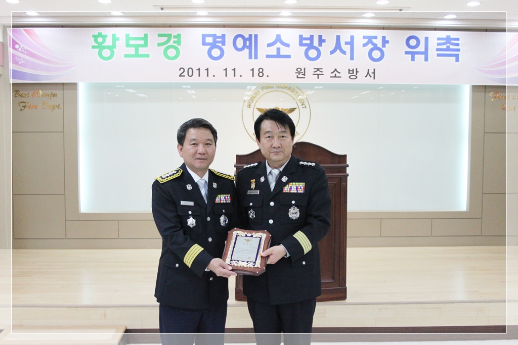 황보경 명예소방서장은 명예서장 위촉패를 전달받고 간부소개 및 원주소방서 업무를 보고받았다.