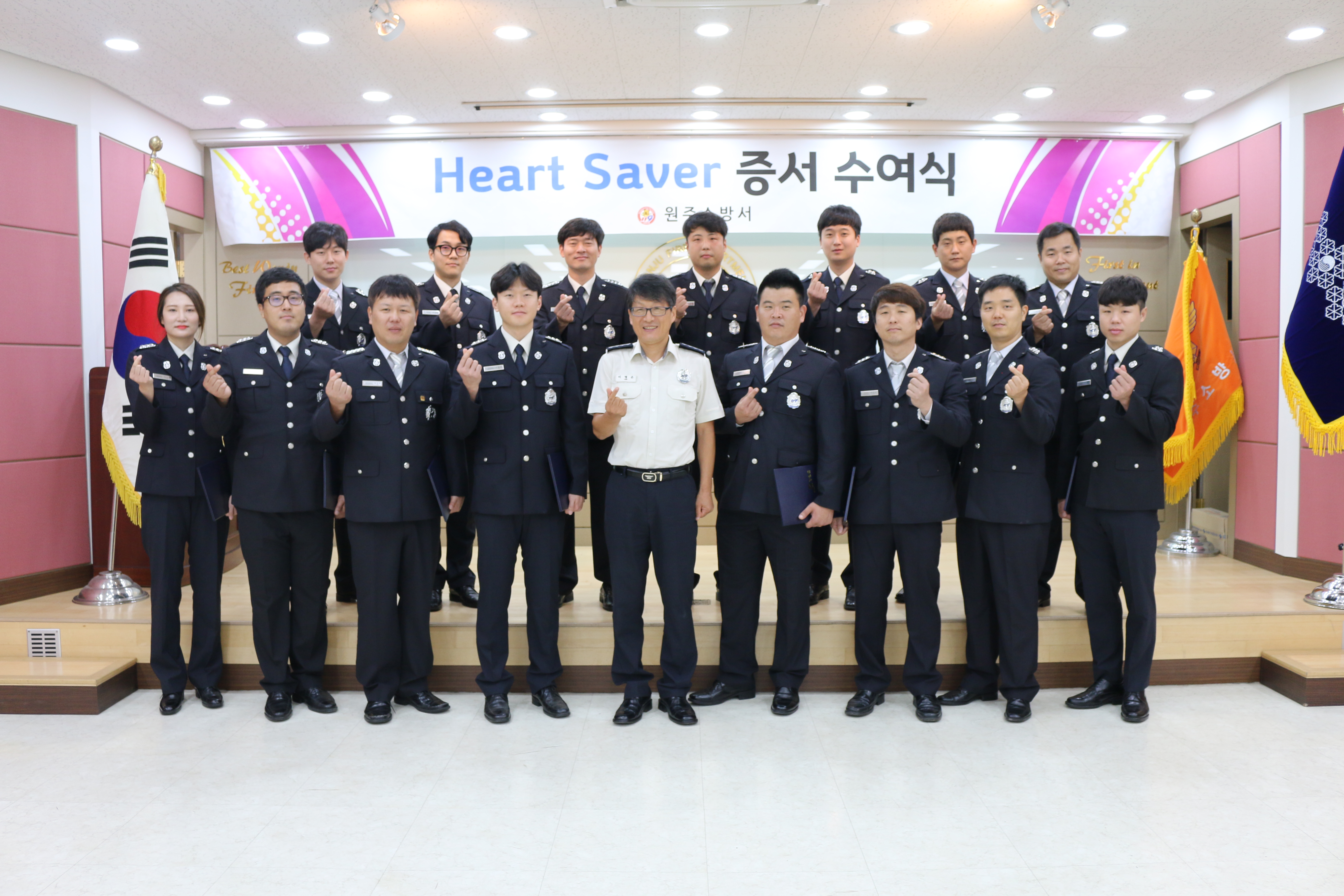 원주소방서(서장 이병은)는 10일 오전 10시 본서 대회의실에서 하트세이버 적격자 16명을 대상으로 하트세이버(Heart-Saver) 증서 수여식을 개최했다.