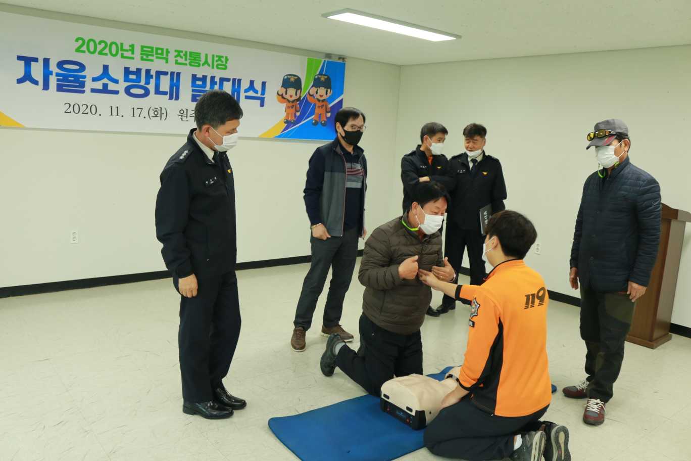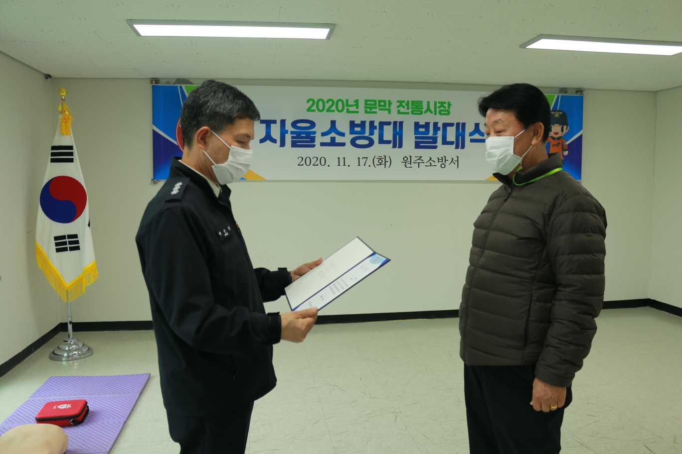이날 발대식에는 문막 전통시장 김용환 자율소방대장을 비롯한 자율소방대 7명과 박순걸 방호구조과장 등 소방서 관계자 6명이 참석한 가운데 진행됐습니다.