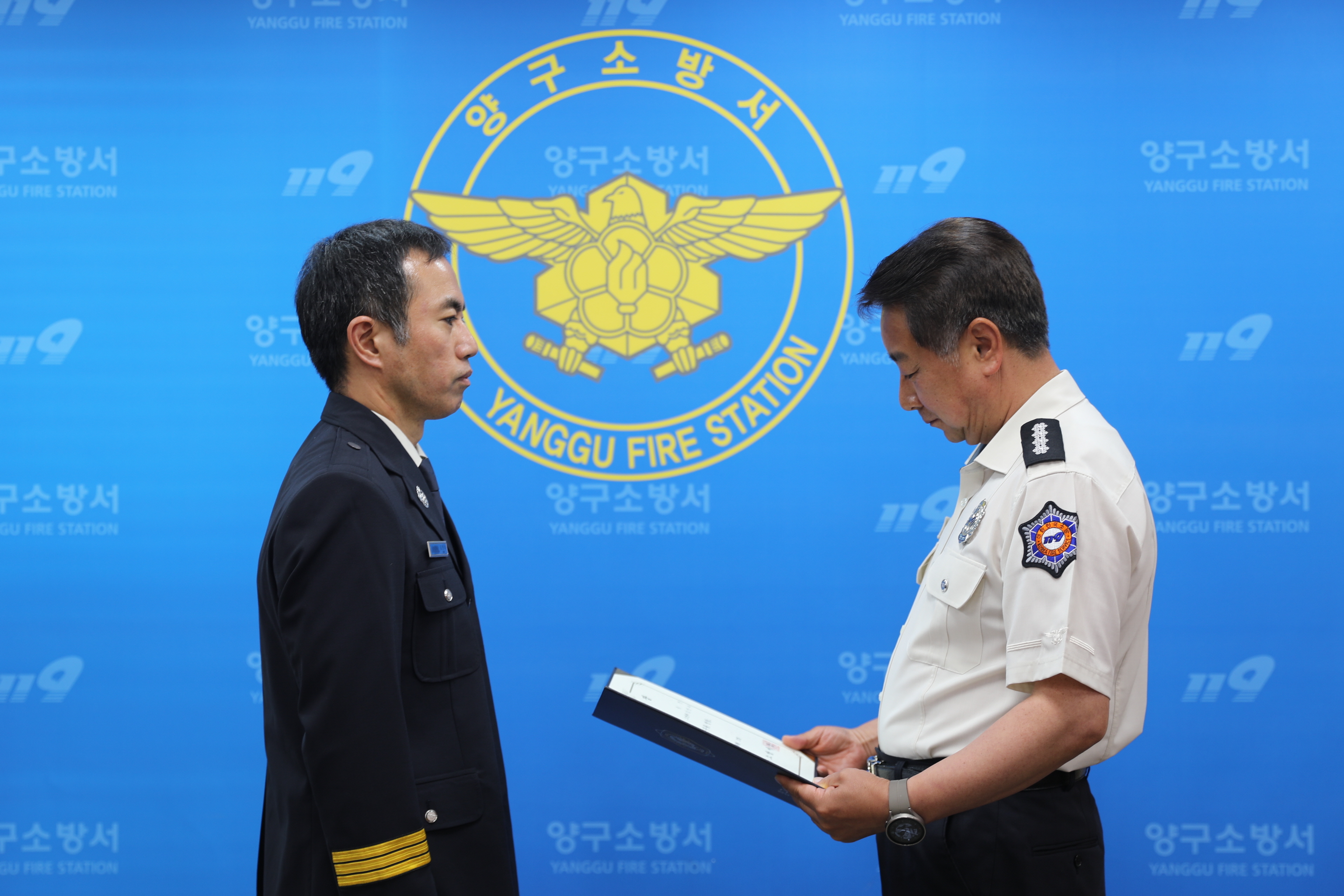 양구소방서에서 승진자 임용식을 가졌습니다. 양구소방서 상황실 상황관리로 3년여간 이라는 시간동안 고생하신 김민수님 축하드립니다! (소방장에서 소방위로 진급하였다)