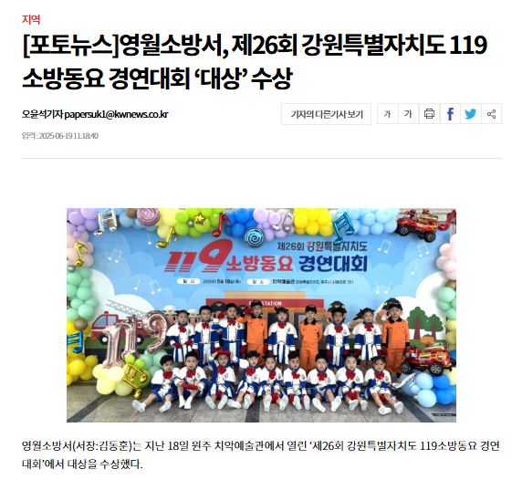 영월소방서·내성어린이집, 제26회 강원특별자치도 119소방동요 경연대회 대상 수상(25년 6월 19일)