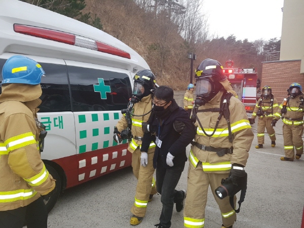 훈련 주요 내용은 ▲화재 시 자위소방대의 대피유도 훈련 및 초기 화재진압 ▲현장 출동 대원의 인명 검색과 구조, 화재 진압 ▲자체 소방시설 활용법(소화기, 소화전 사용법)교육 ▲심폐소생술 교육 및 대처요령 ▲강원119 신고앱 사용법 교육 등으로 진행됐다.