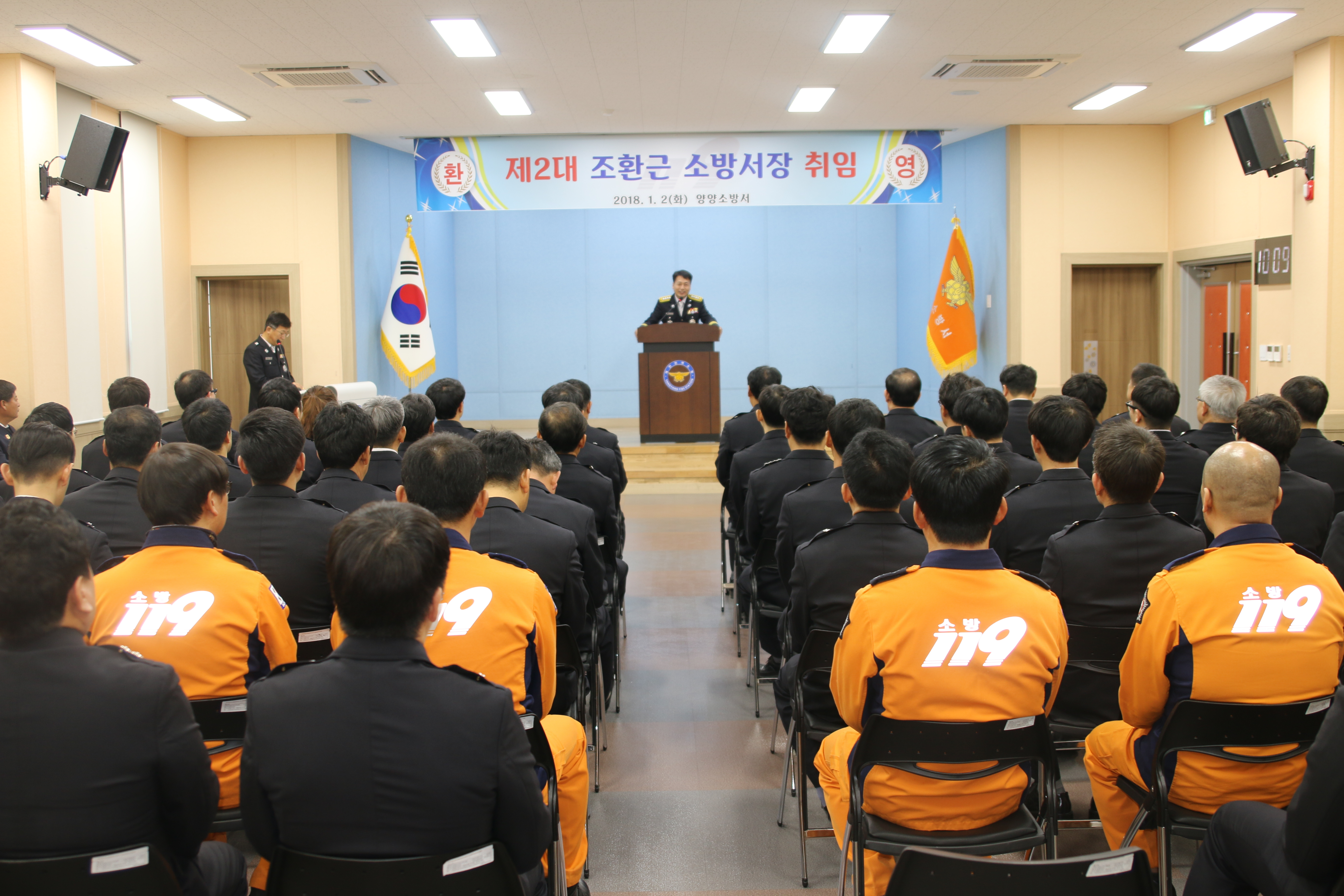 양양소방서(서장 조환근)는 2일 오전 10시 양양소방서 대회의실에서 소방공무원과 의용소방대 등 80여명이 참석한 가운데 제2대 조환근 양양소방서장 취임식 및 무술년 새해 힘찬 출발을 다짐하는 2018년 시무식을 개최했다.