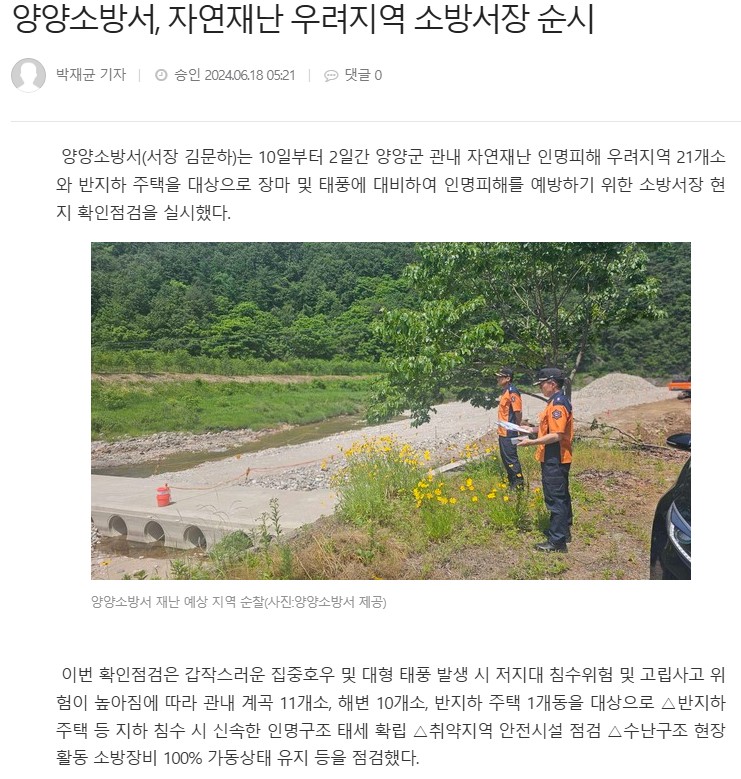 양양소방서(서장 김문하)는 10일부터 2일간 양양군 관내 자연재난 인명피해 우려지역 21개소와 반지하 주택을 대상으로 장마 및 태풍에 대비하여 인명피해를 예방하기 위한 소방서장 현지 확인점검을 실시했다.